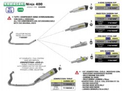 Silencioso escape Arrow 71874PRI Pro-Race Kawasaki Ninja 400 / Z400 2019 (Nichrom). Slip-on Arrow 71874PRI deriva directamente de los escapes de Moto Gp con forma de trompeta. El cuerpo principal del silencioso Arrow 71874PRI está fabricado en nichrom muy ligero y robusto. Para compensar la reducción del volumen, Arrow ha trabajado arduamente en la investigación de los mejores materiales fonoabsorbentes y termo aislantes. Se han realizado innumerables pruebas en pista y en el Departamento de Investigación y Desarrollo que le han permitido a Arrow introducir materiales y tecnologías nuevas más eficaces en el proceso de producción. Estos silenciosos los encontramos en version racing y homologada con Db-killer. (La información que facilita Ramirez Motoracing es orientativa y sujeta a la verificación en la web del fabricante).