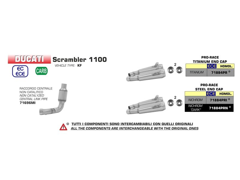 Kit silenciosos escape Arrow 71884PRN Ducati Scrambler 1100 2018 Pro-Race (Nichrom Dark). Kit slip-ons Arrow 71884PRN derivados directamente de los escapes de Moto Gp con forma de trompeta. Este silencioso no es posible adaptarlo a todos los modelos de moto debido al modelo del terminal y a que al tener poco volumen interno, se limita el mantener el nivel del ruido bajo control. Al tener forma de cono, el silencioso Arrow 71884PRN se sujeta al marco con unos puntos de soldadura, por lo que no se puede emplear abrazaderas de carbono o acero inox como en los otros silenciosos. El cuerpo principal del silencioso Arrow 71828PRN está fabricado en Nichrom. Para compensar la reducción del volumen, Arrow ha trabajado arduamente en la investigación de los mejores materiales fonoabsorbentes y termo aislantes. Se han realizado innumerables pruebas en pista y en el Departamento de Investigación y Desarrollo que le han permitido a Arrow introducir materiales y tecnologías nuevas más eficaces en el proceso de producción. Estos silenciosos los encontramos en version racing y homologada con Db-killer. (La información que facilita Ramirez Motoracing es orientativa y sujeta a la verificación en la web del fabricante).
