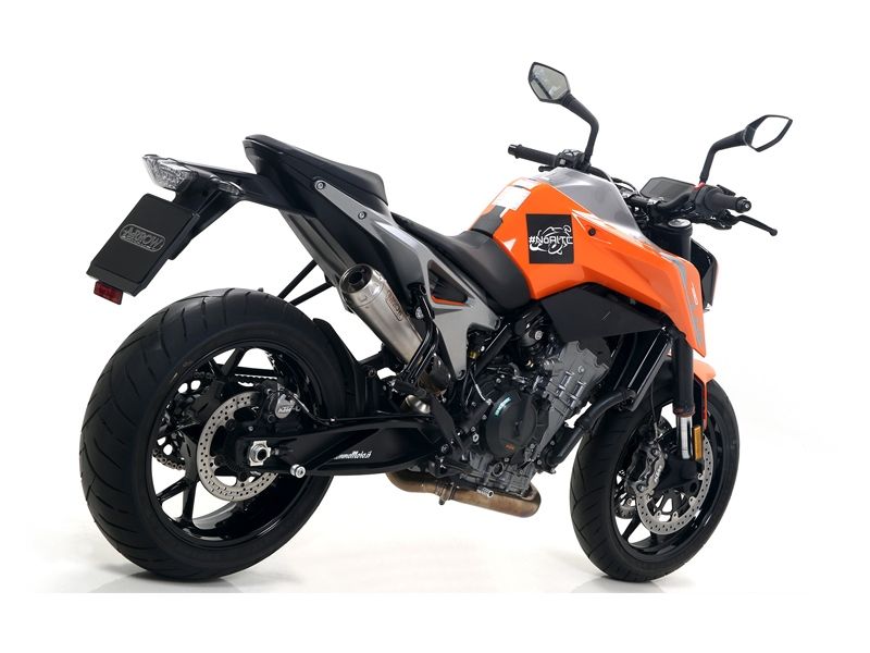 Silencioso escape Arrow 71890PR Ktm Duke 790 2018/2019 Pro-Race (titanium). Slip-on Arrow 71890PR deriva directamente de los escapes de Moto Gp con forma de trompeta. Este silencioso no es posible adaptarlo a todos los modelos de moto debido al modelo del terminal y a que al tener poco volumen interno, se limita el mantener el nivel del ruido bajo control. Al tener forma de cono, el silencioso Arrow 71890PR se sujeta al marco con unos puntos de soldadura, por lo que no se puede emplear abrazaderas de carbono o acero inox como en los otros silenciosos.