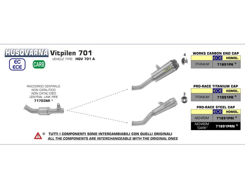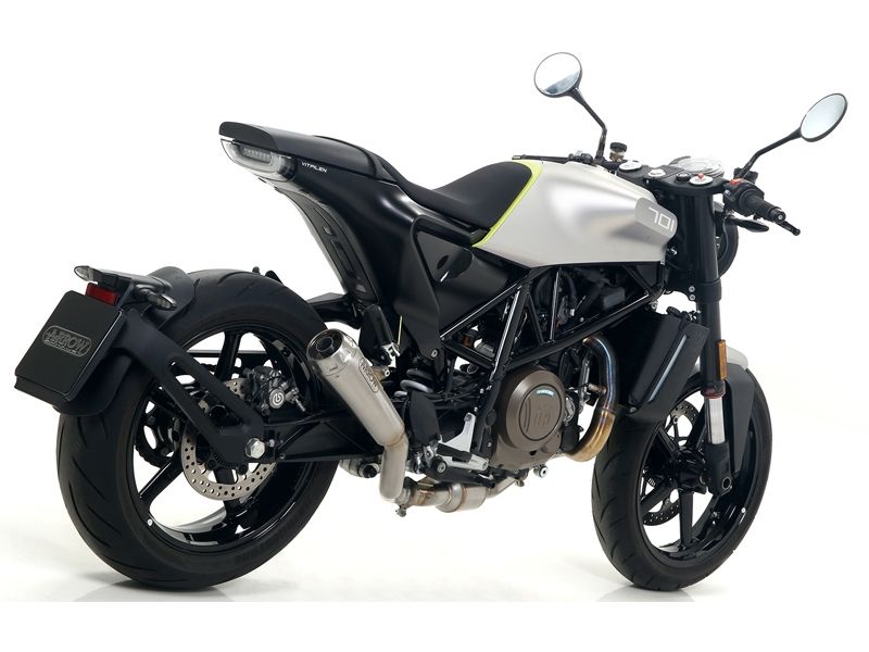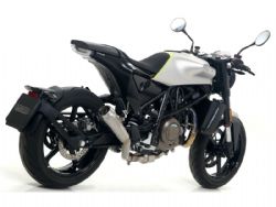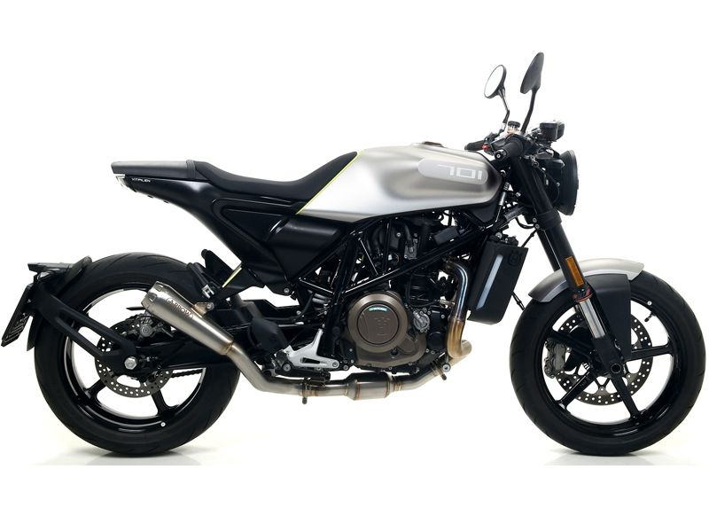 Silencioso escape Arrow 71891PR Husqvarna Vitpilen 701 2018/2019 Pro-Race (titanium). Slip-on Arrow 71891PR deriva directamente de los escapes de Moto Gp con forma de trompeta. Este silencioso no es posible adaptarlo a todos los modelos de moto debido al modelo del terminal y a que al tener poco volumen interno, se limita el mantener el nivel del ruido bajo control. Al tener forma de cono, el silencioso Arrow 71891PR se sujeta al marco con unos puntos de soldadura, por lo que no se puede emplear abrazaderas de carbono o acero inox como en los otros silenciosos.