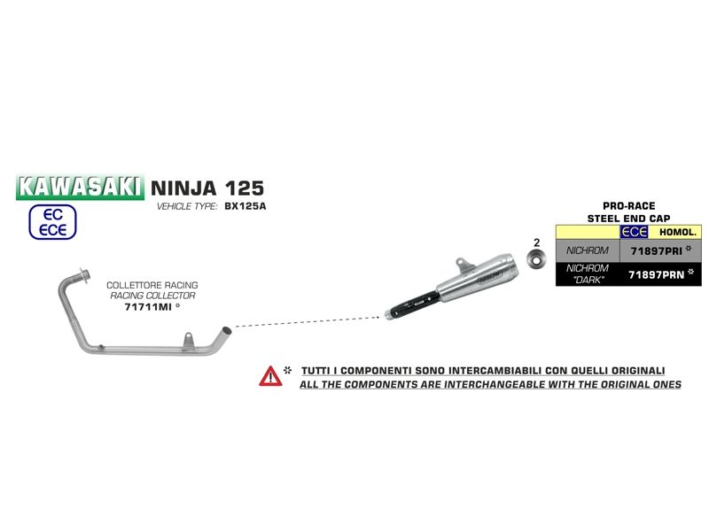 Silencioso escape Arrow 71897PRI Kawasaki NINJA 125 2019 Pro-Race (Nichrom). Slip-on Arrow 71897PRI deriva directamente de los escapes de Moto Gp con forma de trompeta. El cuerpo principal del silencioso Arrow 71897PRI está fabricado en acero inoxidable Nichrom muy ligero y robusto. Para compensar la reducción del volumen, Arrow ha trabajado arduamente en la investigación de los mejores materiales fonoabsorbentes y termo aislantes. Se han realizado innumerables pruebas en pista y en el Departamento de Investigación y Desarrollo que le han permitido a Arrow introducir materiales y tecnologías nuevas más eficaces en el proceso de producción. Estos silenciosos los encontramos en version racing y homologada con Db-killer. (La información que facilita Ramirez Motoracing es orientativa y sujeta a la verificación en la web del fabricante).