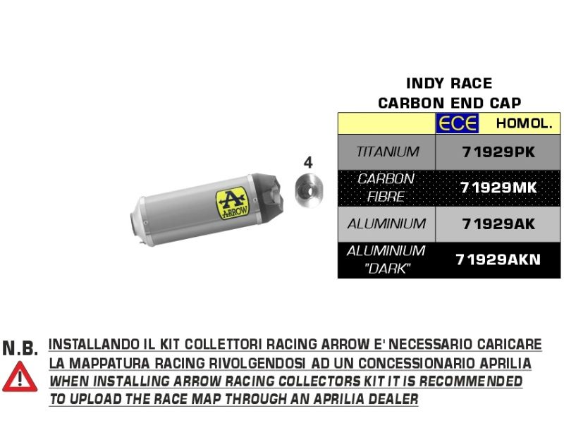 Cuando combinamos el silencioso Arrow 71929 con el colector 71755MI (racing) es recomendable configurar la centralita en un concesionario oficial Aprilia.
