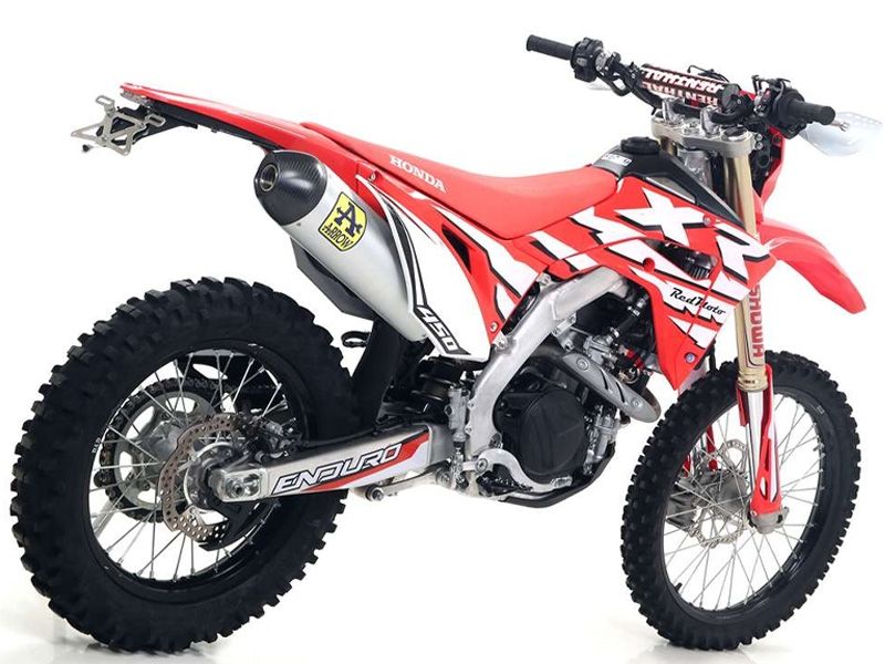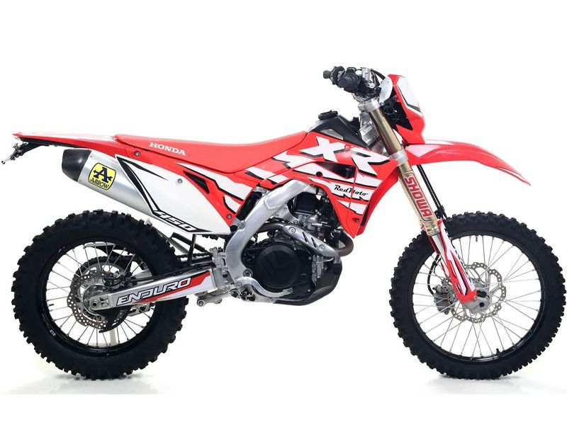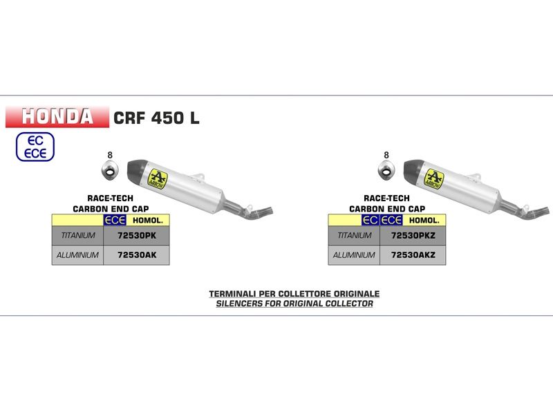 Escape Arrow 72530AK Race-Tech Honda CRF 450 L 2019. El silencioso Arrow Race-Tech 72530AK se caracteriza por su diseño en forma de diamante que garantiza una disminución del peso, sin afectar el volumen interno ni los niveles de ruido. Realizado interiormente en acero inox con la funda exterior en diferentes materiales (titanio, carbono o aluminio según modelo). Los componentes internos del silencioso están realizados en acero inoxidable y ensamblados con soldaduras de tecnología TIG. Todas las por donde hay flujo de gas se mantienen bajo un estricto control dimensional para optimizar el flujo de gas. La terminación posterior y la salida de gases están diseñadas para optimizar la salida del flujo de gases libre de turbulencias, reduciendo los efectos negativos de la presión. (La información que facilita Ramirez Motoracing es orientativa y sujeta a la verificación en la web del fabricante).