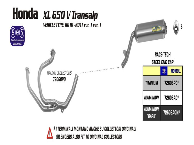 ARROW RACE-TECH HONDA XL 650 V TRANSALP 2000/2007 SILENCIOSO HOMOLOGADO EN ALUMINIO CONVENCIONAL CON COPA DE ACERO INOX REF: 72606AO.