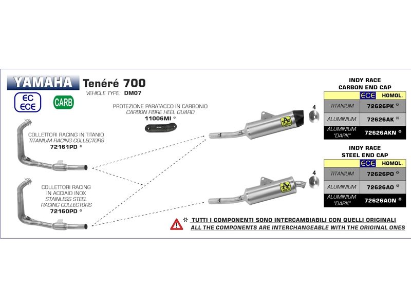 Escape Arrow 72626AKN Indy Race Yamaha Tenere 700. El silencioso Arrow 72626AKN Indy Race nace para poder satisfacer la demanda de muchas motos las cuales por su diseño, no se les puede instalar ningun silencioso Arrow. Se caracteriza por su forma ovalada, un poco más aplastado con respecto a otros silencioso de escape, aunque sigue manteniendo un buen volumen interno favoreciendo así la reduccion del ruido. El cuerpo del silencioso está disponible en titanio, aluminio o fibra de carbono muy ligero y robusto y para la terminación de la copa posterior se ha utilizado carbono. (La información que facilita Ramirez Motoracing es orientativa y sujeta a la verificación en la web del fabricante).