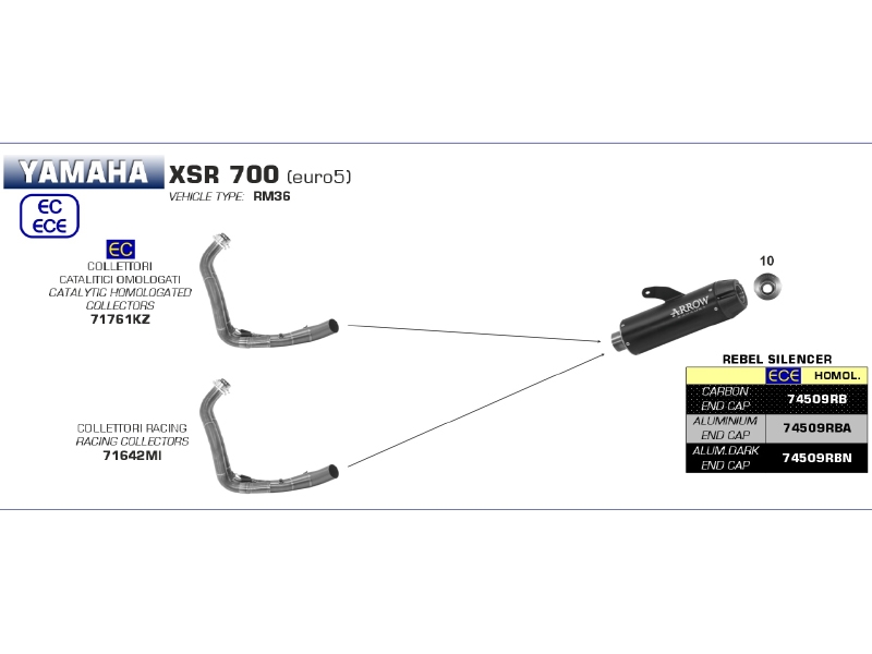 Pack ahorro escape Arrow Yamaha XSR 700 2021. El pack incluye el colector obligatorio 71642MI o 71761KZ y el silencioso Rebel 74509RB, 74509RBA o 74509RB. Elige tu combinación ideal!