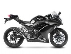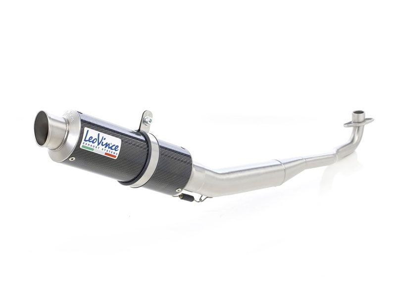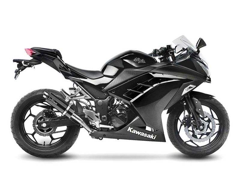 Escape completo Leovince 3296 Kawasaki Ninja 250 / 300 R/ABS 2013/2016 Gp Corsa Evo Carbono. Escape inspirado en Moto Gp y diseñado para motocicletas de 4 tiempos hasta 500cc de cilindrada. Silencioso fabricado en carbono brillante con salida cortada. Los colectores de gran diámetro garantizan un gran rendimiento. El escape se fija a la moto con una abrazadera en acero inox, con goma antivibraciones. El silencioso cuenta con una pegatina en aluminio con el logo de la marca para embellecer al silencioso.