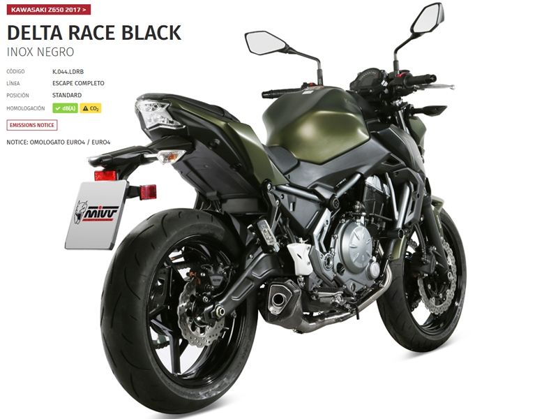 Escape Mivv K.044.LDRB Kawasaki Z650 2017. Principalmente diseñado para mejorar la estética, el sonido y rendimiento de la moto, el escape slip-on Mivv Delta Race Black es la última incorporación a la gama de escape de la fábrica italiana. Este escape completo con colectores en acero ofrece detalles de calidad con el único propósito de satisfacer a los motoristas más exigentes. El escape completo Mivv K.044.LDRB Delta Race Black se caracteriza por su diseño de forma exclusiva que, a través de una transformación progresiva, termina siendo de cónico a hexagonal. Incorpora tapa en carbono twill 3K, abrazadera perimetral con doble remachado o el casquillo de entrada fabricado solidamente para un enganche preciso. En el silencioso está el característico logo Mivv realizado por la tecnología Láser. (La información que facilita Ramirez Motoracing es orientativa y sujeta a la verificación en la web del fabricante).