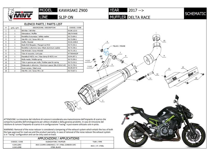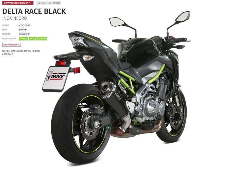 Escape Mivv K.045.LDRB Kawasaki Z900 2017. Principalmente diseñado para mejorar la estética, el sonido y rendimiento de la moto, el escape slip-on Mivv Delta Race es la última incorporación a la gama de escape de la fábrica italiana. Este escape ofrece detalles de calidad con el único propósito de satisfacer a los motoristas más exigentes. El escape Mivv K.045.LDRB Delta Race se caracteriza por su diseño de forma exclusiva que, a través de una transformación progresiva, termina siendo de cónico a hexagonal. Incorpora tapa en carbono twill 3K, abrazadera perimetral con doble remachado o el casquillo de entrada fabricado solidamente para un enganche preciso. En el silencioso está el característico logo Mivv realizado por la tecnología Láser. (La información que facilita Ramirez Motoracing es orientativa y sujeta a la verificación en la web del fabricante).