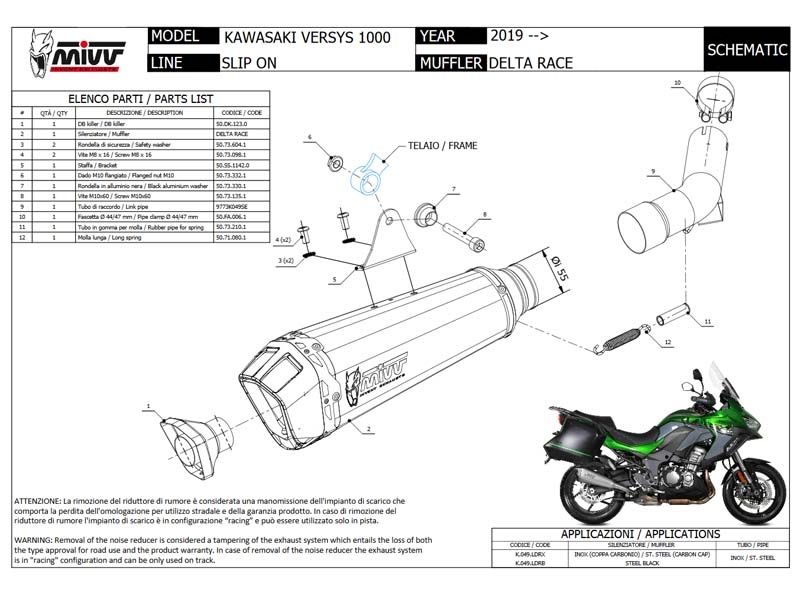 Escape Mivv K.049.LDRX Delta Race Kawasaki Versys 1000 2019. Principalmente diseñado para mejorar la estética, el sonido y rendimiento de la moto, el escape slip-on Mivv Delta Race es la última incorporación a la gama de escape de la fábrica italiana. Este escape ofrece detalles de calidad con el único propósito de satisfacer a los motoristas más exigentes. El escape Mivv K.049.LDRX Delta Race se caracteriza por su diseño de forma exclusiva que, a través de una transformación progresiva, termina siendo de cónico a hexagonal. Incorpora tapa en carbono twill 3K, abrazadera perimetral con doble remachado o el casquillo de entrada fabricado solidamente para un enganche preciso. En el silencioso está el característico logo Mivv realizado por la tecnología Láser. (La información que facilita Ramirez Motoracing es orientativa y sujeta a la verificación en la web del fabricante).