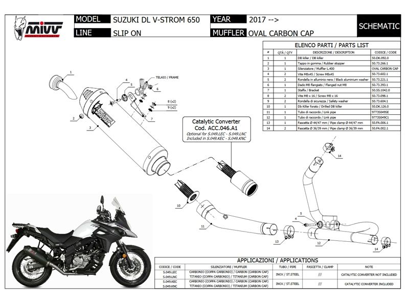 Escape Mivv S.049.LEC Suzuki Dl V-Strom 650 2017> Oval Carbono / Copa Carbono. Silencioso de escape Slip On Mivv S.049.LEC diseñado específicamente para cada modelo moto y que se caracteriza precisamente por su copa de carbono tipo twill 3k de alta resistencia térmica. El Slip On escape Mivv S.049.LEC está realizado en Carbono para ser resistente y muy ligero y la diferencia de peso respecto al escape original es sustancial. Este silencioso de diseño ovalado, disipa perfectamente el calor gracias sus hendiduras en la copa de carbono, que a su vez, también transmiten un look agresivo. Fabricado con las mejores tecnologías del momento, el Slip On Oval Carbon Carbon Cap deriva directamente de la experiencia de Mivv en los Grandes Premios de motociclismo. El escape Mivv S.049.LEC también ofrece garantía a nivel de prestaciones, asegurando una mejora de potencia y del par de motor. El Slip On Mivv Oval Carbon Carbon Cap es homologado conforme a las normas europeas. (La información que facilita Ramirez Motoracing es orientativa y sujeta a la verificación en la web del fabricante).