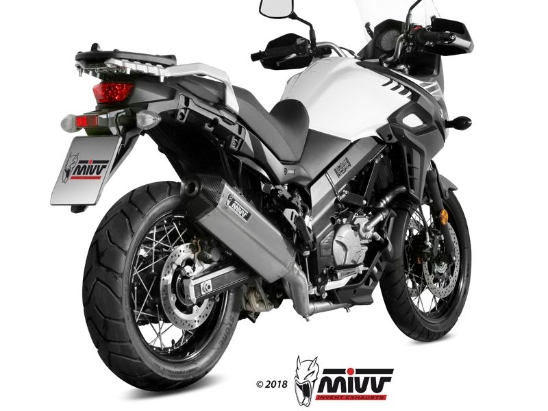 Escape Mivv S.049.LRX Suzuki DL V-Strom 650 2017> Speed Edge Inox. Silencioso de escape Slip On Mivv S.049.LRX diseñado específicamente para cada modelo de moto y que gracias a su diseño comprimido, permite estar lo más cerca posible al bastidor de la moto. El escape slip-on S.049.LRX Speed Edge aporta a la moto excelentes prestaciones, un susntancial ahorra de peso y un look de lo más actual. El silencioso de escape Mivv Speed Edge está realizado en acero inoxidable black para garantizar una extraordinaria resistencia. Para la copa final y la abrazadera de sujección se ha utilizado fibra de carbono de alta calidad. El escape es homologado en todas sus versiones e incorpora Db Killer desmontable. (La información que facilita Ramirez Motoracing es orientativa y sujeta a la verificación en la web del fabricante).