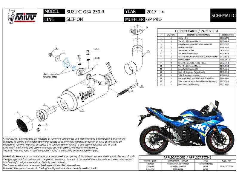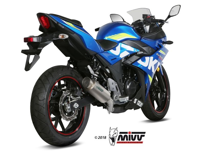 Escape Mivv S.054.L6P Suzuki GSX 250 R 2017> Gp Pro (slip-on). Mivv Gp Pro representa la evolución en tecnología y diseño del exitoso escape Mivv Gp. Este nuevo escape Mivv se caracteriza por ofrecer un diseño compacto y agresivo con acabado de máxima precisión. El tubo de salida del Gp Pro incorpora una rejilla amovible y protectora similar a las que se utilizan en competición. Tras ella se camufla sutilmente el dB-killer para no dañar su estética. La nueva generación de slip-ons Gp Pro ha sido diseñada para motos de última generación deportivas y otros modelos naked. El logotipo de Mivv está realizado por la a través de tecnología láser para un acabado muy fino y elegante. (La información que facilita Ramirez Motoracing es orientativa y sujeta a la verificación en la web del fabricante).