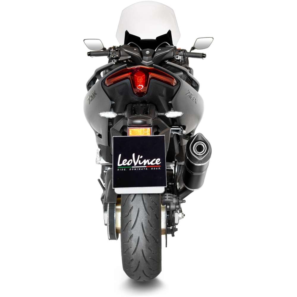 Escape completo Leovince 14342EFB LV One Evo Black Edition Yamaha T-Max 560 2020-2022 (No homologado). Escape completo Leovince Lv One Evo Black Edition 14342EFB específicamente diseñado para la Yamaha T-Max 560 2020-2021. El silencioso Lv One Evo posee un diseño compacto, moderno y de líneas cuadradas. El cuerpo del silencioso está realizado en acero inoxidable conn acabado mate, realizado mediante una pintura cerámica extremadamente resistente a las altas temperaturas. La tapa final del silencioso LV One Evo está cortada asimétricamente y fabricada en fibra de carbono para combinar el máximo rendimiento y ligereza sin renunciar al estilo Made in Italy.