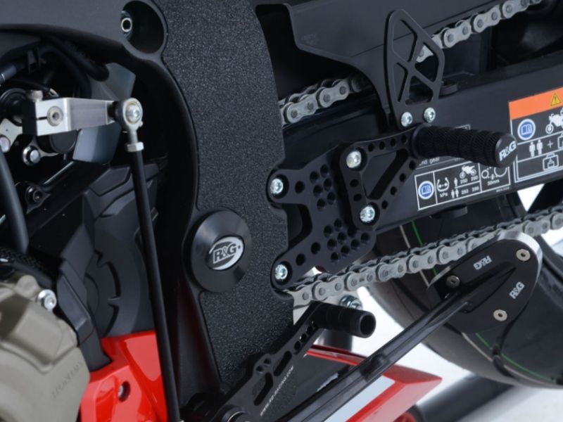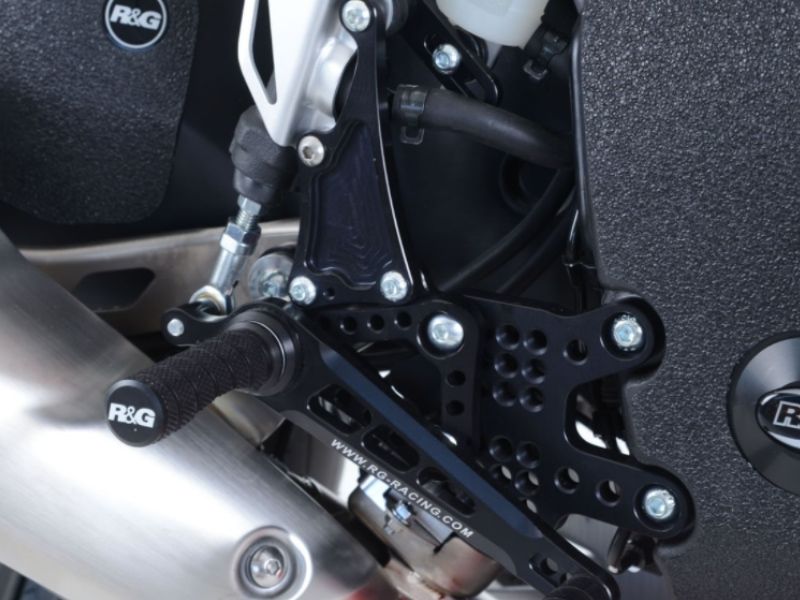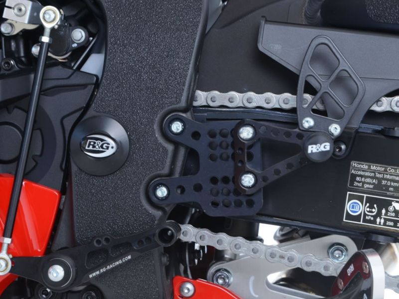 Estriberas RG-Racing RSET02BK Honda CBR1000 RR 2008-2019 / SP 2014-2016. Las estriberas ajustables de R&G Racing ofrecen 11 posiciones precisas para asegurar su compatibilidad con cualquier estatura. Diseñada especifícamente para cada modelo de moto, están fabricadas y fresadas en aluminio ligero para mayor resistencia y durabilidad. Cuentan con un recubierto en polvo en negro muy duradero con gráficos R&G en blanco nítido que le otorgo un aspecto muy definido. Los reposapiés poseen una textura especial para garantizar el máximo agarre incluso en las situaciones más complicadas. Kit de montaje completo, incluidas las instrucciones.