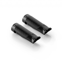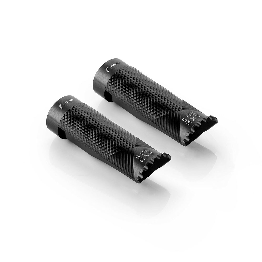 Estriberas Rizoma PE615B Snake EX Pro Negro. Las estriberas Rizoma Snake son lo último del fabricante italiano. Están fabricadas en aluminio mecanizado y cuentan con una textura diseñada para ofrecer un alto rendimiento en términos de agarre y funcionamiento. Su diseño simula escamas verticales y gracias al proceso 3D de alta precisión, se obtiene un agarre direccional para retener el pie en los momentos de máxima reacción durante la conducción. El diseño de la parte final de la estribera se caracteriza por su corona dentada que minimiza la posibilidad de pérdida de agarre lateral, sobretodo cuando el motorista realiza una presión superior del pie sobre la zona más externa de la estribera.