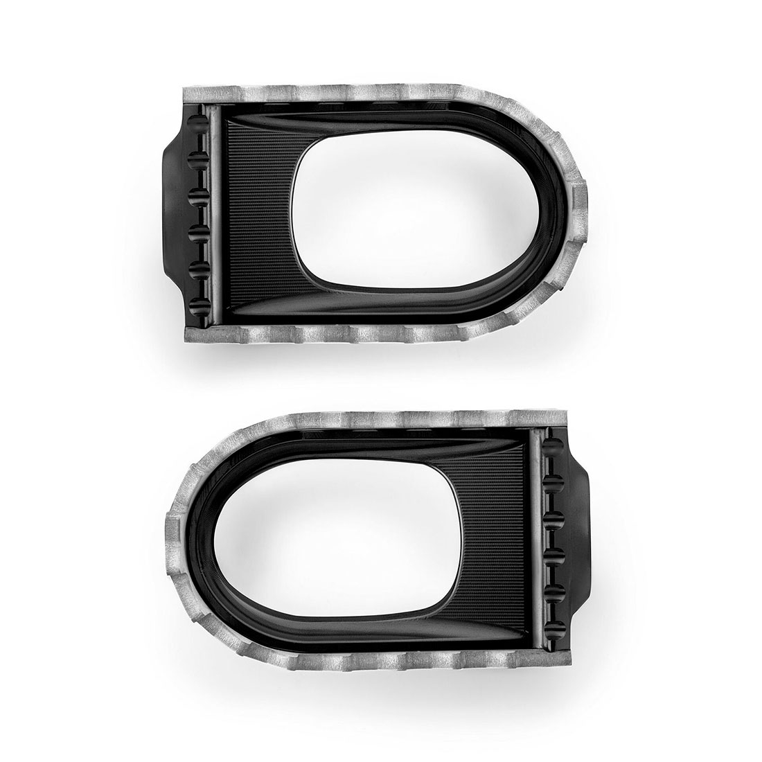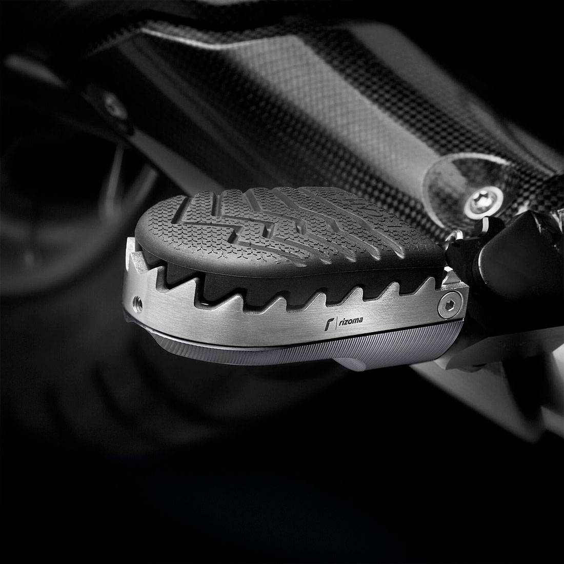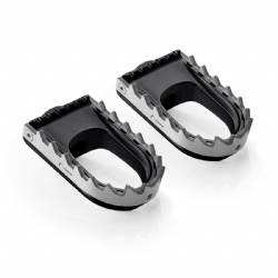 De hecho, Cuando quitamos la inserción de EPDM, se convierte en una estribera mucho más agresiva y prácticamente muy similar a las de off-road. El dentado exterior de acero satinado está diseñado especialmente para evitar la pérdida de agarre lateral, en particular cuando el motorista ejerce una mayor presión del pie hacia parte más exterior de la estribera.