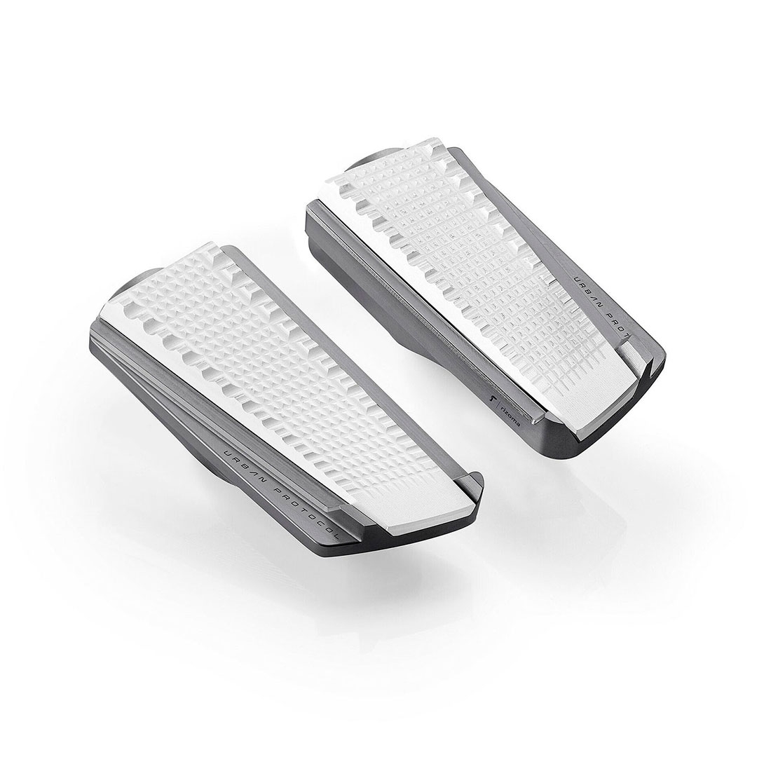 Estriberas Rizoma PE643D Urban Protocol EX Street Thunder Gris. Las estriberas Urban Protocol representan la mejor esencia de Rizoma en mecanizados de alta precisión de aluminio. Su diseño innovador se caracteriza por un doble anodizado y por la particular técnica de acabado a mezclar. La amplia base de la estribera garantiza una ergonomía superior e incluye una placa central antideslizante y fácilmente desmontable. El acabado de pasador dentado en contraste resalta la zona de agarre. Las estriberas Uban Protocol son el accesorio ideal para motos Custom y New-Retro.