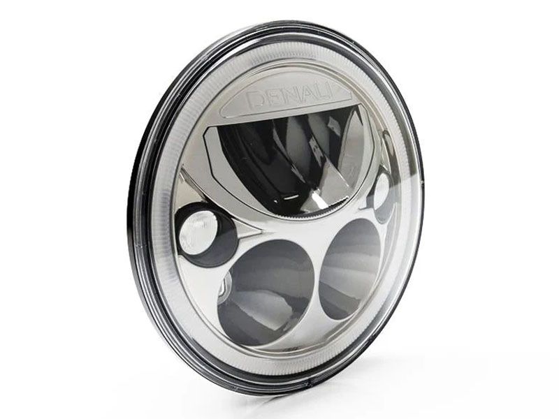 Faro de LED Denali M7 E-Mark TT-M7E. El faro delantero universal para moto de LED Denali TT-M7E M7, con certificación E-Mark, es un reemplazo directo para los faros delanteros originales de 7 pulgadas. Tiene luces bajas extra anchas, luces altas bajas y luces altas de halo. Inserta este módulo de faro en la carcasa del faro existente y proyecta un haz tres veces más largo que los faros halógenos convencionales y el doble de largo que los faros LED convencionales.