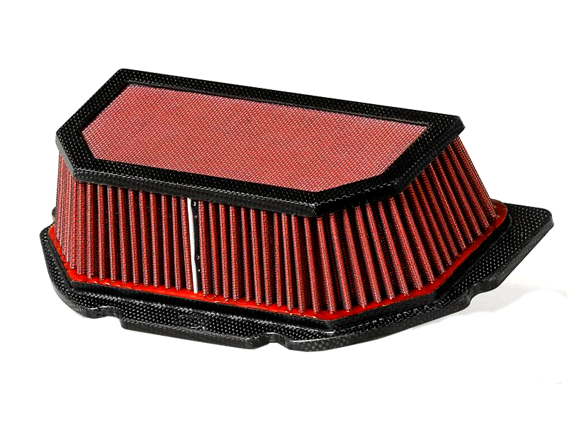 Filtro de potencia Bmc CRF440/04. Los filtros de aire Bmc Carbon Racing Filter garantizan un elevado de alto rendimiento en motos de carretera y de competición. Posee una estructura de soporte fabricada enteramente en tejido de fibra de carbono autoclave y preimpregnado junto con un elemento filtrante de algodón. El filtro de aire Bmc Carbon Racing Filter posee un avanzado diseño que permite utilizar el mayor volumen posible de la caja de aire de serie, lo cual también permite disponer de una mayor superficie de filtración y por tanto, una mayor entrada de flujo del aire al motor. El resultado es una mejor canalización del flujo de aire en la fase de admisión con una constante presión en la caja de aire. El elemento filtrante está realizado con un material filtrante especial de múltiples capas en la configuración RACE (de competición), impregnado con aceite de baja viscosidad y colocado entre mallas de aluminio tratadas con resinas epoxi (para evitar la oxidación). La configuración RACE proporciona elevados niveles de permeabilidad así como una mínima resistencia al flujo de aire para garantizar una gran eficiencia de filtración.