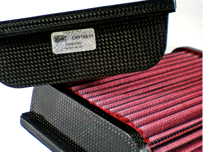 Filtro de potencia Bmc CRF759/01. Los filtros de aire Bmc Carbon Racing Filter garantizan un elevado de alto rendimiento en motos de carretera y de competición. Posee una estructura de soporte fabricada enteramente en tejido de fibra de carbono autoclave y preimpregnado junto con un elemento filtrante de algodón. El filtro de aire Bmc Carbon Racing Filter posee un avanzado diseño que permite utilizar el mayor volumen posible de la caja de aire de serie, lo cual también permite disponer de una mayor superficie de filtración y por tanto, una mayor entrada de flujo del aire al motor. El resultado es una mejor canalización del flujo de aire en la fase de admisión con una constante presión en la caja de aire. El elemento filtrante está realizado con un material filtrante especial de múltiples capas en la configuración RACE (de competición), impregnado con aceite de baja viscosidad y colocado entre mallas de aluminio tratadas con resinas epoxi (para evitar la oxidación). La configuración RACE proporciona elevados niveles de permeabilidad así como una mínima resistencia al flujo de aire para garantizar una gran eficiencia de filtración.