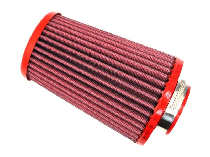 Filtro aire Bmc FBTS70-150 (Versión standard con menos entrada de aire). El filtro de aire Bmc Filter FBTS70-150 posee un diseño específico y está diseñado para colocar en sustitución al filtro de aire original. El filtro de potencia Bmc FBTS70-150 de alto rendimiento cuenta con la misma forma que el filtro standard, pero con una base de filtrado mayor. Este filtro reutilizable se caracteriza por su diseño que mejora notablemente la capacidad de aspiración de la toma de aire en comparación con los filtros tradicionales, mejorando también la calidad de la combustión. El filtro de potencia Bmc FBTS70-150 consta de una gasa de algodón de múltiples capas impregnada con aceite de baja viscosidad y recubierta con una malla de aluminio tratado con resina epoxy que garantiza la protección contra los humos del combustible y la oxidación debida a la humedad del aire. Las impurezas se filtran gracias al efecto pantalla y de retención, siendo capturadas por las fibras de algodón y retenidas por el aceite. Este proceso no obstruye la entrada de aire y garantiza el rendimiento constante del filtro de aire a largo plazo. El proceso de filtrado es continuo y los cuerpos extraños quedan depositados en el tejido sin bloquear el flujo de aire. El filtros Bmc está realizado mediante un sistema de “moldeado completo” que permite al característico filtro rojo ser de una sola pieza, sin juntas soldadas, lo cual evita la rotura. La goma que se utiliza en los sistemas de filtrado de aire Bmc es muy resistente y duradera, y posee unas características de adherencia óptimas para adaptarse a todas las formas de las cajas de aire.