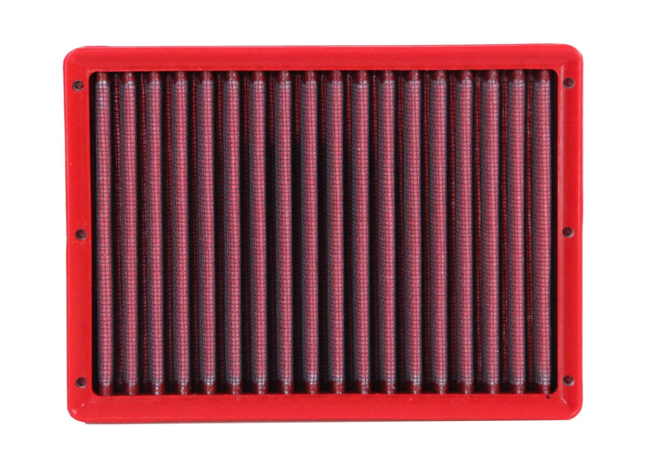 Filtro aire Bmc FM01026 KTM 790 Duke (Versión standard con menos entrada de aire). El filtro de aire Bmc Filter FM01026 posee un diseño específico y está diseñado para colocar en sustitución al filtro de aire original. El filtro de potencia Bmc FM01026 de alto rendimiento cuenta con la misma forma que el filtro standard, pero con una base de filtrado mayor. Este filtro reutilizable se caracteriza por su diseño que mejora notablemente la capacidad de aspiración de la toma de aire en comparación con los filtros tradicionales, mejorando también la calidad de la combustión. El filtro de potencia Bmc FM01026 consta de una gasa de algodón de múltiples capas impregnada con aceite de baja viscosidad y recubierta con una malla de aluminio tratado con resina epoxy que garantiza la protección contra los humos del combustible y la oxidación debida a la humedad del aire. Las impurezas se filtran gracias al efecto pantalla y de retención, siendo capturadas por las fibras de algodón y retenidas por el aceite. Este proceso no obstruye la entrada de aire y garantiza el rendimiento constante del filtro de aire a largo plazo. El proceso de filtrado es continuo y los cuerpos extraños quedan depositados en el tejido sin bloquear el flujo de aire. El filtros Bmc está realizado mediante un sistema de “moldeado completo” que permite al característico filtro rojo ser de una sola pieza, sin juntas soldadas, lo cual evita la rotura. La goma que se utiliza en los sistemas de filtrado de aire Bmc es muy resistente y duradera, y posee unas características de adherencia óptimas para adaptarse a todas las formas de las cajas de aire.