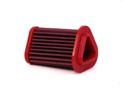 Filtro aire Bmc FM01070 Royal Enfield Interceptor 650 (Versión standard con menos entrada de aire). El filtro de aire Bmc Filter FM01070 posee un diseño específico y está diseñado para colocar en sustitución al filtro de aire original. El filtro de potencia Bmc FM01070 de alto rendimiento cuenta con la misma forma que el filtro standard, pero con una base de filtrado mayor. Este filtro reutilizable se caracteriza por su diseño que mejora notablemente la capacidad de aspiración de la toma de aire en comparación con los filtros tradicionales, mejorando también la calidad de la combustión. El filtro de potencia Bmc FM01070 consta de una gasa de algodón de múltiples capas impregnada con aceite de baja viscosidad y recubierta con una malla de aluminio tratado con resina epoxy que garantiza la protección contra los humos del combustible y la oxidación debida a la humedad del aire. Las impurezas se filtran gracias al efecto pantalla y de retención, siendo capturadas por las fibras de algodón y retenidas por el aceite. Este proceso no obstruye la entrada de aire y garantiza el rendimiento constante del filtro de aire a largo plazo. El proceso de filtrado es continuo y los cuerpos extraños quedan depositados en el tejido sin bloquear el flujo de aire. El filtros Bmc está realizado mediante un sistema de “moldeado completo” que permite al característico filtro rojo ser de una sola pieza, sin juntas soldadas, lo cual evita la rotura. La goma que se utiliza en los sistemas de filtrado de aire Bmc es muy resistente y duradera, y posee unas características de adherencia óptimas para adaptarse a todas las formas de las cajas de aire.