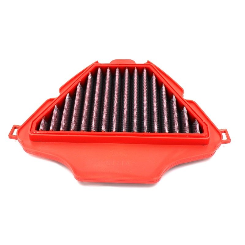 Filtro aire Bmc FM01114 Honda Forza 750 / X-ADV 750 2021 (Versión standard). El filtro de aire Bmc Filter FM01114 posee un diseño específico y está diseñado para colocar en sustitución al filtro de aire original. El filtro de potencia Bmc FM01114 de alto rendimiento cuenta con la misma forma que el filtro standard, pero con una base de filtrado mayor. Este filtro reutilizable se caracteriza por su diseño que mejora notablemente la capacidad de aspiración de la toma de aire en comparación con los filtros tradicionales, mejorando también la calidad de la combustión. El filtro de potencia Bmc FM01114 consta de una gasa de algodón de múltiples capas impregnada con aceite de baja viscosidad y recubierta con una malla de aluminio tratado con resina epoxy que garantiza la protección contra los humos del combustible y la oxidación debida a la humedad del aire. Las impurezas se filtran gracias al efecto pantalla y de retención, siendo capturadas por las fibras de algodón y retenidas por el aceite. Este proceso no obstruye la entrada de aire y garantiza el rendimiento constante del filtro de aire a largo plazo. El proceso de filtrado es continuo y los cuerpos extraños quedan depositados en el tejido sin bloquear el flujo de aire. El filtros Bmc está realizado mediante un sistema de “moldeado completo” que permite al característico filtro rojo ser de una sola pieza, sin juntas soldadas, lo cual evita la rotura. La goma que se utiliza en los sistemas de filtrado de aire Bmc es muy resistente y duradera, y posee unas características de adherencia óptimas para adaptarse a todas las formas de las cajas de aire.