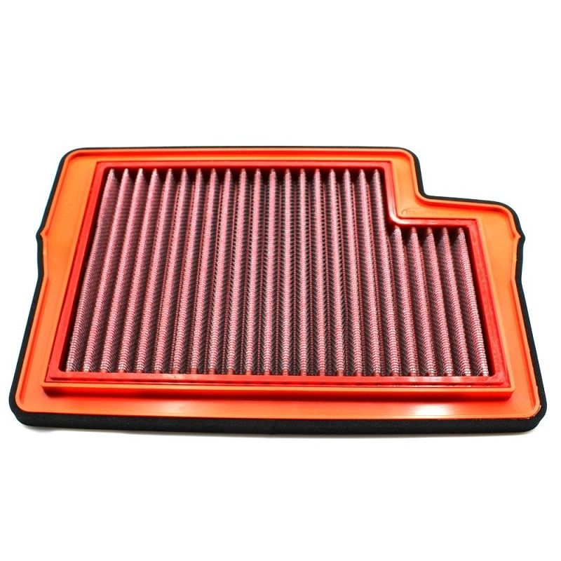 Filtro aire Bmc FM01119 Yamaha MT-09 / MT-09 SP 2021 (Versión standard). El filtro de aire Bmc Filter FM01119 posee un diseño específico y está diseñado para colocar en sustitución al filtro de aire original. El filtro de potencia Bmc FM01119 de alto rendimiento cuenta con la misma forma que el filtro standard, pero con una base de filtrado mayor. Este filtro reutilizable se caracteriza por su diseño que mejora notablemente la capacidad de aspiración de la toma de aire en comparación con los filtros tradicionales, mejorando también la calidad de la combustión. El filtro de potencia Bmc FM01119 consta de una gasa de algodón de múltiples capas impregnada con aceite de baja viscosidad y recubierta con una malla de aluminio tratado con resina epoxy que garantiza la protección contra los humos del combustible y la oxidación debida a la humedad del aire. Las impurezas se filtran gracias al efecto pantalla y de retención, siendo capturadas por las fibras de algodón y retenidas por el aceite. Este proceso no obstruye la entrada de aire y garantiza el rendimiento constante del filtro de aire a largo plazo. El proceso de filtrado es continuo y los cuerpos extraños quedan depositados en el tejido sin bloquear el flujo de aire. El filtros Bmc está realizado mediante un sistema de “moldeado completo” que permite al característico filtro rojo ser de una sola pieza, sin juntas soldadas, lo cual evita la rotura. La goma que se utiliza en los sistemas de filtrado de aire Bmc es muy resistente y duradera, y posee unas características de adherencia óptimas para adaptarse a todas las formas de las cajas de aire.