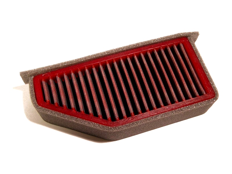 Filtro de potencia Bmc FM236/04 (Versión standard con menos entrada de aire). El filtro de aire Bmc Filter FM236/04 posee un diseño específico y está diseñado para colocar en sustitución al filtro de aire original. El filtro de potencia Bmc FM236/04 de alto rendimiento cuenta con la misma forma que el filtro standard, pero con una base de filtrado mayor. Este filtro reutilizable se caracteriza por su diseño que mejora notablemente la capacidad de aspiración de la toma de aire en comparación con los filtros tradicionales, mejorando también la calidad de la combustión. El filtro de potencia Bmc FM236/04 consta de una gasa de algodón de múltiples capas impregnada con aceite de baja viscosidad y recubierta con una malla de aluminio tratado con resina epoxy que garantiza la protección contra los humos del combustible y la oxidación debida a la humedad del aire. Las impurezas se filtran gracias al efecto pantalla y de retención, siendo capturadas por las fibras de algodón y retenidas por el aceite. Este proceso no obstruye la entrada de aire y garantiza el rendimiento constante del filtro de aire a largo plazo. El proceso de filtrado es continuo y los cuerpos extraños quedan depositados en el tejido sin bloquear el flujo de aire. El filtros Bmc está realizado mediante un sistema de “moldeado completo” que permite al característico filtro rojo ser de una sola pieza, sin juntas soldadas, lo cual evita la rotura. La goma que se utiliza en los sistemas de filtrado de aire Bmc es muy resistente y duradera, y posee unas características de adherencia óptimas para adaptarse a todas las formas de las cajas de aire.