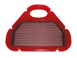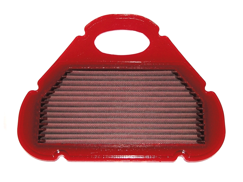 Filtro de potencia Bmc FM249/09 (Versión standard con menos entrada de aire). El filtro de aire Bmc Filter FM249/09 posee un diseño específico y está diseñado para colocar en sustitución al filtro de aire original. El filtro de potencia Bmc FM249/09 de alto rendimiento cuenta con la misma forma que el filtro standard, pero con una base de filtrado mayor. Este filtro reutilizable se caracteriza por su diseño que mejora notablemente la capacidad de aspiración de la toma de aire en comparación con los filtros tradicionales, mejorando también la calidad de la combustión. El filtro de potencia Bmc FM249/09 consta de una gasa de algodón de múltiples capas impregnada con aceite de baja viscosidad y recubierta con una malla de aluminio tratado con resina epoxy que garantiza la protección contra los humos del combustible y la oxidación debida a la humedad del aire. Las impurezas se filtran gracias al efecto pantalla y de retención, siendo capturadas por las fibras de algodón y retenidas por el aceite. Este proceso no obstruye la entrada de aire y garantiza el rendimiento constante del filtro de aire a largo plazo. El proceso de filtrado es continuo y los cuerpos extraños quedan depositados en el tejido sin bloquear el flujo de aire. El filtros Bmc está realizado mediante un sistema de “moldeado completo” que permite al característico filtro rojo ser de una sola pieza, sin juntas soldadas, lo cual evita la rotura. La goma que se utiliza en los sistemas de filtrado de aire Bmc es muy resistente y duradera, y posee unas características de adherencia óptimas para adaptarse a todas las formas de las cajas de aire.
