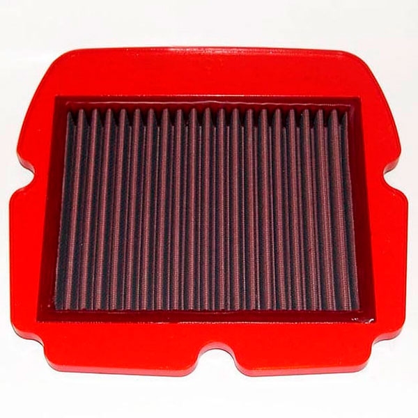 Filtro aire Bmc FM368/04 Honda GL 1800 Gold Wing 2001-2017 (Versión standard con menos entrada de aire). El filtro de aire Bmc Filter FM368/04 posee un diseño específico y está diseñado para colocar en sustitución al filtro de aire original. El filtro de potencia Bmc FM368/04 de alto rendimiento cuenta con la misma forma que el filtro standard, pero con una base de filtrado mayor. Este filtro reutilizable se caracteriza por su diseño que mejora notablemente la capacidad de aspiración de la toma de aire en comparación con los filtros tradicionales, mejorando también la calidad de la combustión. El filtro de potencia Bmc FM368/04 consta de una gasa de algodón de múltiples capas impregnada con aceite de baja viscosidad y recubierta con una malla de aluminio tratado con resina epoxy que garantiza la protección contra los humos del combustible y la oxidación debida a la humedad del aire. Las impurezas se filtran gracias al efecto pantalla y de retención, siendo capturadas por las fibras de algodón y retenidas por el aceite. Este proceso no obstruye la entrada de aire y garantiza el rendimiento constante del filtro de aire a largo plazo. El proceso de filtrado es continuo y los cuerpos extraños quedan depositados en el tejido sin bloquear el flujo de aire. El filtros Bmc está realizado mediante un sistema de “moldeado completo” que permite al característico filtro rojo ser de una sola pieza, sin juntas soldadas, lo cual evita la rotura. La goma que se utiliza en los sistemas de filtrado de aire Bmc es muy resistente y duradera, y posee unas características de adherencia óptimas para adaptarse a todas las formas de las cajas de aire.