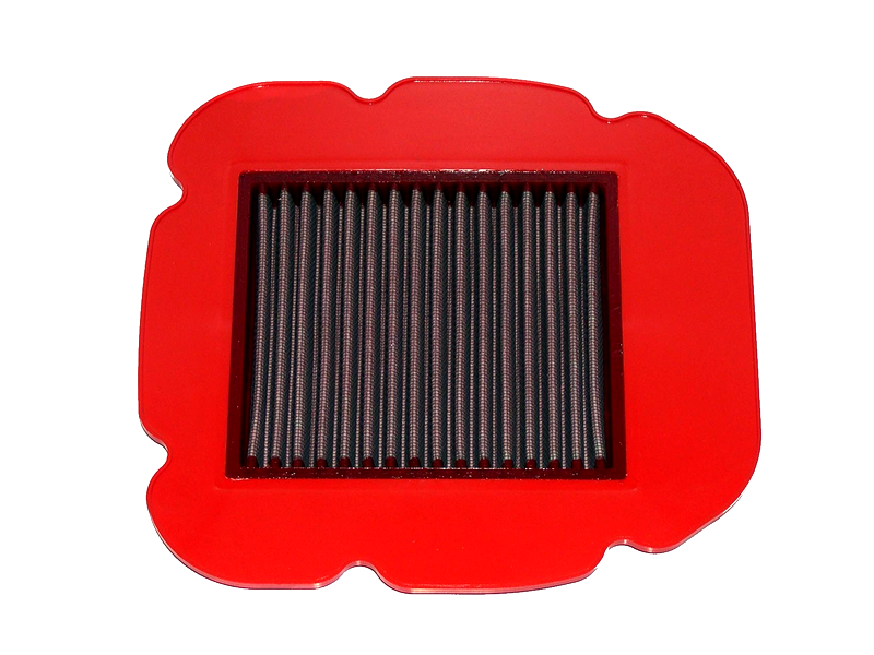 Filtro de potencia Bmc FM378/04 (Versión standard con menos entrada de aire). El filtro de aire Bmc Filter FM378/04 posee un diseño específico y está diseñado para colocar en sustitución al filtro de aire original. El filtro de potencia Bmc FM378/04 de alto rendimiento cuenta con la misma forma que el filtro standard, pero con una base de filtrado mayor. Este filtro reutilizable se caracteriza por su diseño que mejora notablemente la capacidad de aspiración de la toma de aire en comparación con los filtros tradicionales, mejorando también la calidad de la combustión. El filtro de potencia Bmc FM378/04 consta de una gasa de algodón de múltiples capas impregnada con aceite de baja viscosidad y recubierta con una malla de aluminio tratado con resina epoxy que garantiza la protección contra los humos del combustible y la oxidación debida a la humedad del aire. Las impurezas se filtran gracias al efecto pantalla y de retención, siendo capturadas por las fibras de algodón y retenidas por el aceite. Este proceso no obstruye la entrada de aire y garantiza el rendimiento constante del filtro de aire a largo plazo. El proceso de filtrado es continuo y los cuerpos extraños quedan depositados en el tejido sin bloquear el flujo de aire. El filtros Bmc está realizado mediante un sistema de “moldeado completo” que permite al característico filtro rojo ser de una sola pieza, sin juntas soldadas, lo cual evita la rotura. La goma que se utiliza en los sistemas de filtrado de aire Bmc es muy resistente y duradera, y posee unas características de adherencia óptimas para adaptarse a todas las formas de las cajas de aire.