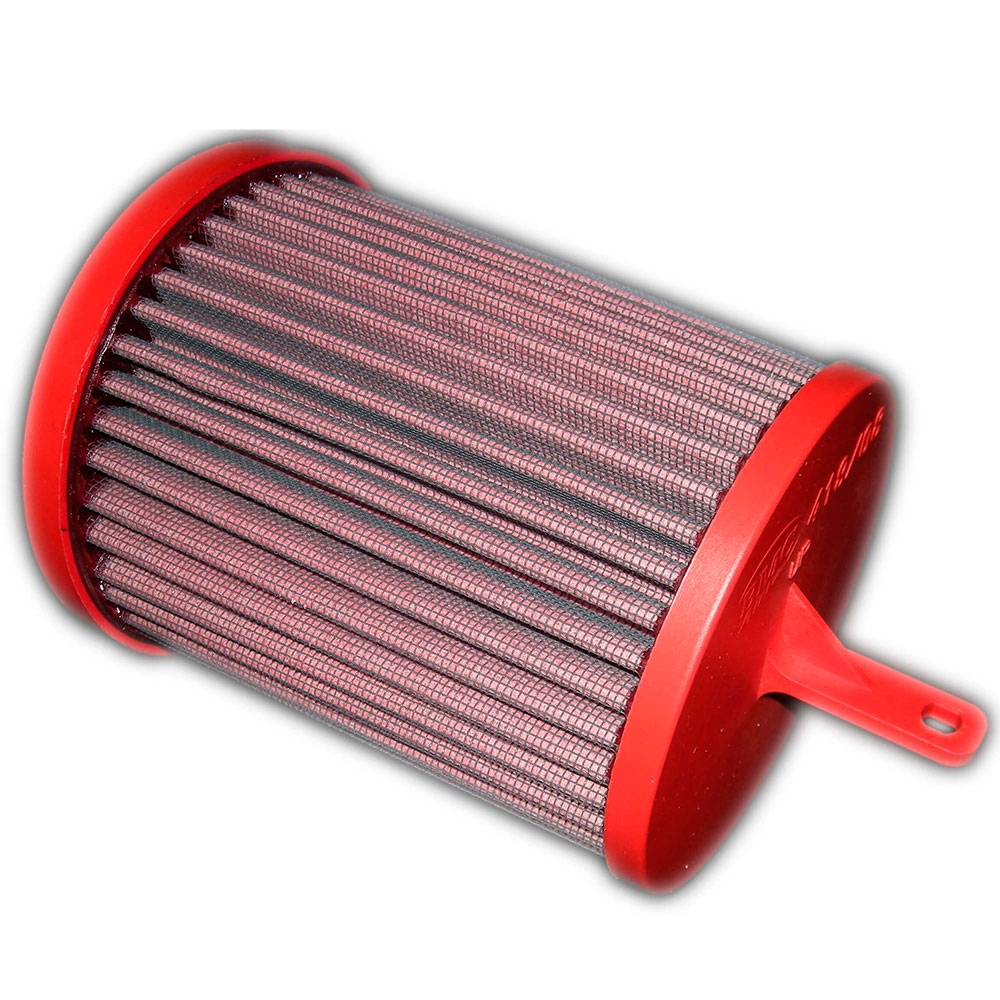 Filtro aire Bmc FM418/08 (Versión standard con menos entrada de aire). El filtro de aire Bmc Filter FM418/08 posee un diseño específico y está diseñado para colocar en sustitución al filtro de aire original. El filtro de potencia Bmc FM418/08 de alto rendimiento cuenta con la misma forma que el filtro standard, pero con una base de filtrado mayor. Este filtro reutilizable se caracteriza por su diseño que mejora notablemente la capacidad de aspiración de la toma de aire en comparación con los filtros tradicionales, mejorando también la calidad de la combustión. El filtro de potencia Bmc FM418/08 consta de una gasa de algodón de múltiples capas impregnada con aceite de baja viscosidad y recubierta con una malla de aluminio tratado con resina epoxy que garantiza la protección contra los humos del combustible y la oxidación debida a la humedad del aire. Las impurezas se filtran gracias al efecto pantalla y de retención, siendo capturadas por las fibras de algodón y retenidas por el aceite. Este proceso no obstruye la entrada de aire y garantiza el rendimiento constante del filtro de aire a largo plazo. El proceso de filtrado es continuo y los cuerpos extraños quedan depositados en el tejido sin bloquear el flujo de aire. El filtros Bmc está realizado mediante un sistema de “moldeado completo” que permite al característico filtro rojo ser de una sola pieza, sin juntas soldadas, lo cual evita la rotura. La goma que se utiliza en los sistemas de filtrado de aire Bmc es muy resistente y duradera, y posee unas características de adherencia óptimas para adaptarse a todas las formas de las cajas de aire.