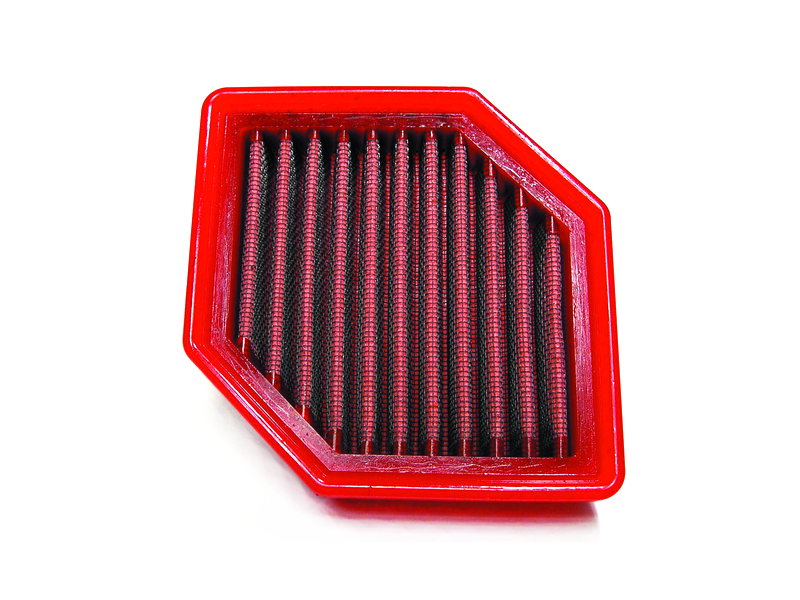 Filtro de potencia Bmc FM439/01 (Versión standard con menos entrada de aire). El filtro de aire Bmc Filter FM439/01 posee un diseño específico y está diseñado para colocar en sustitución al filtro de aire original. El filtro de potencia Bmc FM439/01 de alto rendimiento cuenta con la misma forma que el filtro standard, pero con una base de filtrado mayor. Este filtro reutilizable se caracteriza por su diseño que mejora notablemente la capacidad de aspiración de la toma de aire en comparación con los filtros tradicionales, mejorando también la calidad de la combustión. El filtro de potencia Bmc FM439/01 consta de una gasa de algodón de múltiples capas impregnada con aceite de baja viscosidad y recubierta con una malla de aluminio tratado con resina epoxy que garantiza la protección contra los humos del combustible y la oxidación debida a la humedad del aire. Las impurezas se filtran gracias al efecto pantalla y de retención, siendo capturadas por las fibras de algodón y retenidas por el aceite. Este proceso no obstruye la entrada de aire y garantiza el rendimiento constante del filtro de aire a largo plazo. El proceso de filtrado es continuo y los cuerpos extraños quedan depositados en el tejido sin bloquear el flujo de aire. El filtros Bmc está realizado mediante un sistema de “moldeado completo” que permite al característico filtro rojo ser de una sola pieza, sin juntas soldadas, lo cual evita la rotura. La goma que se utiliza en los sistemas de filtrado de aire Bmc es muy resistente y duradera, y posee unas características de adherencia óptimas para adaptarse a todas las formas de las cajas de aire.