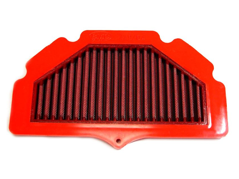 Filtro de potencia Bmc FM449/04 (Versión standard con menos entrada de aire). El filtro de aire Bmc Filter FM449/04 posee un diseño específico y está diseñado para colocar en sustitución al filtro de aire original. El filtro de potencia Bmc FM449/04 de alto rendimiento cuenta con la misma forma que el filtro standard, pero con una base de filtrado mayor. Este filtro reutilizable se caracteriza por su diseño que mejora notablemente la capacidad de aspiración de la toma de aire en comparación con los filtros tradicionales, mejorando también la calidad de la combustión. El filtro de potencia Bmc FM449/04 consta de una gasa de algodón de múltiples capas impregnada con aceite de baja viscosidad y recubierta con una malla de aluminio tratado con resina epoxy que garantiza la protección contra los humos del combustible y la oxidación debida a la humedad del aire. Las impurezas se filtran gracias al efecto pantalla y de retención, siendo capturadas por las fibras de algodón y retenidas por el aceite. Este proceso no obstruye la entrada de aire y garantiza el rendimiento constante del filtro de aire a largo plazo. El proceso de filtrado es continuo y los cuerpos extraños quedan depositados en el tejido sin bloquear el flujo de aire. El filtros Bmc está realizado mediante un sistema de “moldeado completo” que permite al característico filtro rojo ser de una sola pieza, sin juntas soldadas, lo cual evita la rotura. La goma que se utiliza en los sistemas de filtrado de aire Bmc es muy resistente y duradera, y posee unas características de adherencia óptimas para adaptarse a todas las formas de las cajas de aire.