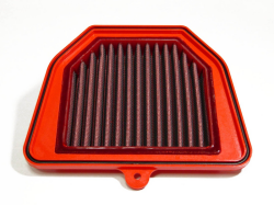 Filtro de potencia Bmc FM456/04 (Versión standard con menos entrada de aire). El filtro de aire Bmc Filter FM456/04 posee un diseño específico y está diseñado para colocar en sustitución al filtro de aire original. El filtro de potencia Bmc FM456/04 de alto rendimiento cuenta con la misma forma que el filtro standard, pero con una base de filtrado mayor. Este filtro reutilizable se caracteriza por su diseño que mejora notablemente la capacidad de aspiración de la toma de aire en comparación con los filtros tradicionales, mejorando también la calidad de la combustión. El filtro de potencia Bmc FM456/04 consta de una gasa de algodón de múltiples capas impregnada con aceite de baja viscosidad y recubierta con una malla de aluminio tratado con resina epoxy que garantiza la protección contra los humos del combustible y la oxidación debida a la humedad del aire. Las impurezas se filtran gracias al efecto pantalla y de retención, siendo capturadas por las fibras de algodón y retenidas por el aceite. Este proceso no obstruye la entrada de aire y garantiza el rendimiento constante del filtro de aire a largo plazo. El proceso de filtrado es continuo y los cuerpos extraños quedan depositados en el tejido sin bloquear el flujo de aire. El filtros Bmc está realizado mediante un sistema de “moldeado completo” que permite al característico filtro rojo ser de una sola pieza, sin juntas soldadas, lo cual evita la rotura. La goma que se utiliza en los sistemas de filtrado de aire Bmc es muy resistente y duradera, y posee unas características de adherencia óptimas para adaptarse a todas las formas de las cajas de aire.