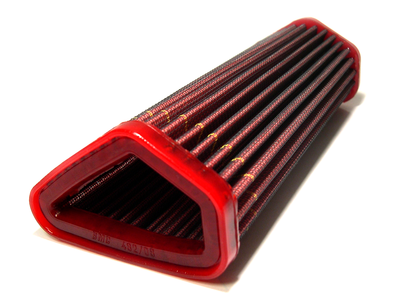 Filtro de potencia Bmc FM482/08 (Versión standard con menos entrada de aire). El filtro de aire Bmc Filter FM482/08 posee un diseño específico y está diseñado para colocar en sustitución al filtro de aire original. El filtro de potencia Bmc FM482/08 de alto rendimiento cuenta con la misma forma que el filtro standard, pero con una base de filtrado mayor. Este filtro reutilizable se caracteriza por su diseño que mejora notablemente la capacidad de aspiración de la toma de aire en comparación con los filtros tradicionales, mejorando también la calidad de la combustión. El filtro de potencia Bmc FM482/08 consta de una gasa de algodón de múltiples capas impregnada con aceite de baja viscosidad y recubierta con una malla de aluminio tratado con resina epoxy que garantiza la protección contra los humos del combustible y la oxidación debida a la humedad del aire. Las impurezas se filtran gracias al efecto pantalla y de retención, siendo capturadas por las fibras de algodón y retenidas por el aceite. Este proceso no obstruye la entrada de aire y garantiza el rendimiento constante del filtro de aire a largo plazo. El proceso de filtrado es continuo y los cuerpos extraños quedan depositados en el tejido sin bloquear el flujo de aire. El filtros Bmc está realizado mediante un sistema de “moldeado completo” que permite al característico filtro rojo ser de una sola pieza, sin juntas soldadas, lo cual evita la rotura. La goma que se utiliza en los sistemas de filtrado de aire Bmc es muy resistente y duradera, y posee unas características de adherencia óptimas para adaptarse a todas las formas de las cajas de aire.