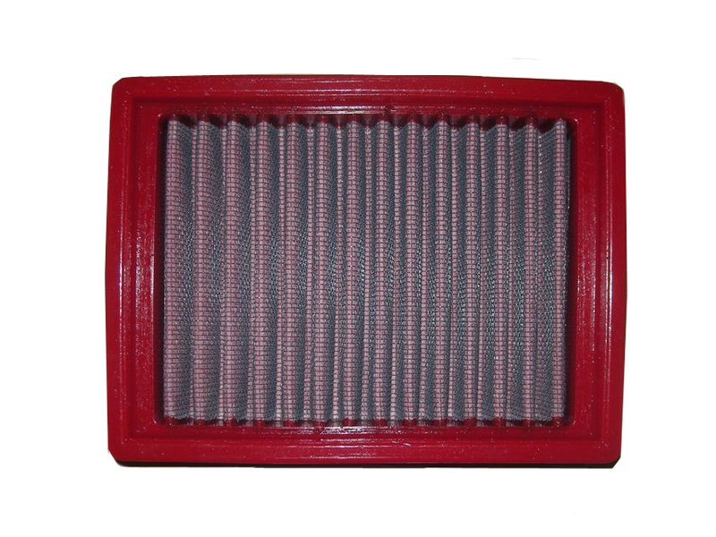 Filtro de potencia Bmc FM504/20 (Versión standard con menos entrada de aire). El filtro de aire Bmc Filter FM504/20 posee un diseño específico y está diseñado para colocar en sustitución al filtro de aire original. El filtro de potencia Bmc FM504/20 de alto rendimiento cuenta con la misma forma que el filtro standard, pero con una base de filtrado mayor. Este filtro reutilizable se caracteriza por su diseño que mejora notablemente la capacidad de aspiración de la toma de aire en comparación con los filtros tradicionales, mejorando también la calidad de la combustión. El filtro de potencia Bmc FM504/20 consta de una gasa de algodón de múltiples capas impregnada con aceite de baja viscosidad y recubierta con una malla de aluminio tratado con resina epoxy que garantiza la protección contra los humos del combustible y la oxidación debida a la humedad del aire. Las impurezas se filtran gracias al efecto pantalla y de retención, siendo capturadas por las fibras de algodón y retenidas por el aceite. Este proceso no obstruye la entrada de aire y garantiza el rendimiento constante del filtro de aire a largo plazo. El proceso de filtrado es continuo y los cuerpos extraños quedan depositados en el tejido sin bloquear el flujo de aire. El filtros Bmc está realizado mediante un sistema de “moldeado completo” que permite al característico filtro rojo ser de una sola pieza, sin juntas soldadas, lo cual evita la rotura. La goma que se utiliza en los sistemas de filtrado de aire Bmc es muy resistente y duradera, y posee unas características de adherencia óptimas para adaptarse a todas las formas de las cajas de aire.