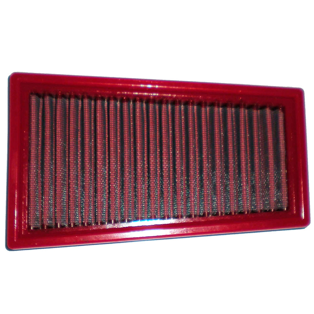 Filtro aire Bmc FM526/20 (Versión standard con menos entrada de aire). El filtro de aire Bmc Filter FM526/20 posee un diseño específico y está diseñado para colocar en sustitución al filtro de aire original. El filtro de potencia Bmc FM526/20 de alto rendimiento cuenta con la misma forma que el filtro standard, pero con una base de filtrado mayor. Este filtro reutilizable se caracteriza por su diseño que mejora notablemente la capacidad de aspiración de la toma de aire en comparación con los filtros tradicionales, mejorando también la calidad de la combustión. El filtro de potencia Bmc FM526/20 consta de una gasa de algodón de múltiples capas impregnada con aceite de baja viscosidad y recubierta con una malla de aluminio tratado con resina epoxy que garantiza la protección contra los humos del combustible y la oxidación debida a la humedad del aire. Las impurezas se filtran gracias al efecto pantalla y de retención, siendo capturadas por las fibras de algodón y retenidas por el aceite. Este proceso no obstruye la entrada de aire y garantiza el rendimiento constante del filtro de aire a largo plazo. El proceso de filtrado es continuo y los cuerpos extraños quedan depositados en el tejido sin bloquear el flujo de aire. El filtros Bmc está realizado mediante un sistema de “moldeado completo” que permite al característico filtro rojo ser de una sola pieza, sin juntas soldadas, lo cual evita la rotura. La goma que se utiliza en los sistemas de filtrado de aire Bmc es muy resistente y duradera, y posee unas características de adherencia óptimas para adaptarse a todas las formas de las cajas de aire.