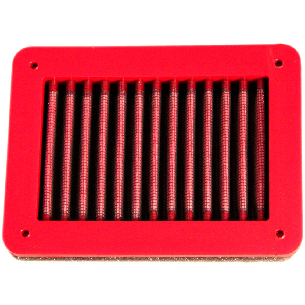 Filtro aire Bmc FM528/20-01RACE (Versión Race con más entrada de aire). El filtro de aire Bmc Filter FM528/20-01RACE posee un diseño específico y está diseñado para colocar en sustitución al filtro de aire original. El filtro de potencia Bmc FM528/20-01RACE de alto rendimiento cuenta con la misma forma que el filtro standard, pero con una base de filtrado mayor incluso que los filtros Bmc standard). Este filtro de carreras reutilizable se caracteriza por su diseño que mejora notablemente la capacidad de aspiración de la toma de aire en comparación con los filtros tradicionales, mejorando también la calidad de la combustión. El filtro de potencia Bmc FM528/20-01RACE consta de una gasa de algodón de múltiples capas impregnada con aceite de baja viscosidad y recubierta con una malla de aluminio tratado con resina epoxy que garantiza la protección contra los humos del combustible y la oxidación debida a la humedad del aire. Las impurezas se filtran gracias al efecto pantalla y de retención, siendo capturadas por las fibras de algodón y retenidas por el aceite. Este proceso no obstruye la entrada de aire y garantiza el rendimiento constante del filtro de aire a largo plazo. El proceso de filtrado es continuo y los cuerpos extraños quedan depositados en el tejido sin bloquear el flujo de aire. El filtros Bmc está realizado mediante un sistema de “moldeado completo” que permite al característico filtro rojo ser de una sola pieza, sin juntas soldadas, lo cual evita la rotura. La goma que se utiliza en los sistemas de filtrado de aire Bmc es muy resistente y duradera, y posee unas características de adherencia óptimas para adaptarse a todas las formas de las cajas de aire.