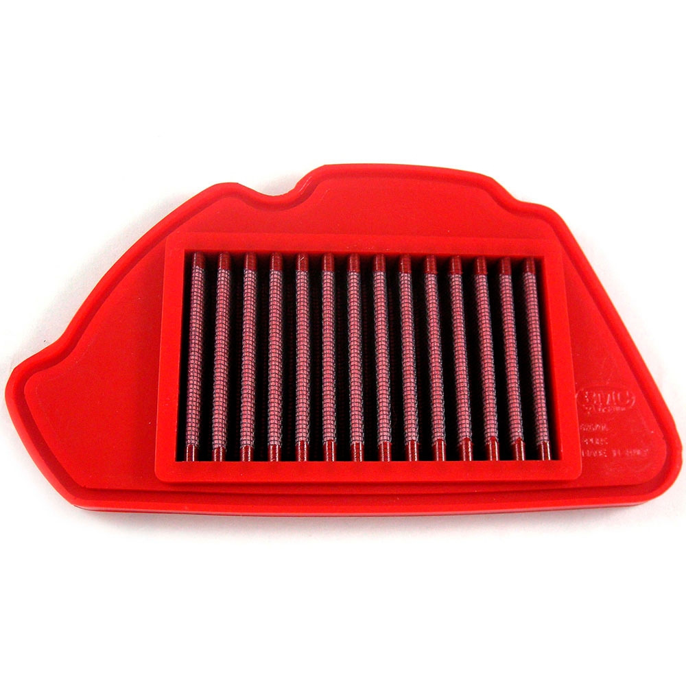 Filtro aire Bmc FM626/04 (Versión standard con menos entrada de aire). El filtro de aire Bmc Filter FM626/04 posee un diseño específico y está diseñado para colocar en sustitución al filtro de aire original. El filtro de potencia Bmc FM626/04 de alto rendimiento cuenta con la misma forma que el filtro standard, pero con una base de filtrado mayor. Este filtro reutilizable se caracteriza por su diseño que mejora notablemente la capacidad de aspiración de la toma de aire en comparación con los filtros tradicionales, mejorando también la calidad de la combustión. El filtro de potencia Bmc FM626/04 consta de una gasa de algodón de múltiples capas impregnada con aceite de baja viscosidad y recubierta con una malla de aluminio tratado con resina epoxy que garantiza la protección contra los humos del combustible y la oxidación debida a la humedad del aire. Las impurezas se filtran gracias al efecto pantalla y de retención, siendo capturadas por las fibras de algodón y retenidas por el aceite. Este proceso no obstruye la entrada de aire y garantiza el rendimiento constante del filtro de aire a largo plazo. El proceso de filtrado es continuo y los cuerpos extraños quedan depositados en el tejido sin bloquear el flujo de aire. El filtros Bmc está realizado mediante un sistema de “moldeado completo” que permite al característico filtro rojo ser de una sola pieza, sin juntas soldadas, lo cual evita la rotura. La goma que se utiliza en los sistemas de filtrado de aire Bmc es muy resistente y duradera, y posee unas características de adherencia óptimas para adaptarse a todas las formas de las cajas de aire.