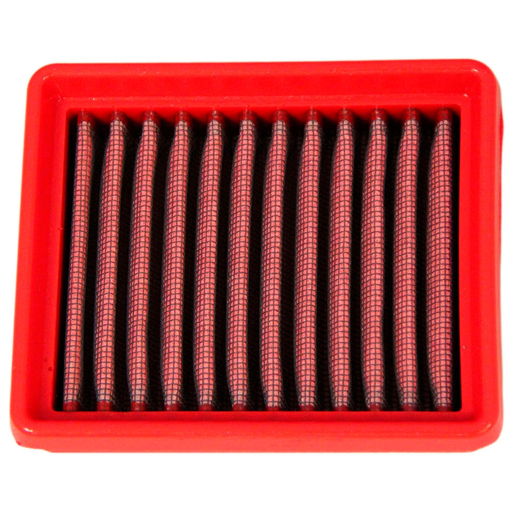 Filtro aire Bmc FM733/20RACE (Versión Race con más entrada de aire). El filtro de aire Bmc Filter FM733/20RACE posee un diseño específico y está diseñado para colocar en sustitución al filtro de aire original. El filtro de potencia Bmc FM733/20RACE de alto rendimiento cuenta con la misma forma que el filtro standard, pero con una base de filtrado mayor incluso que los filtros Bmc standard). Este filtro de carreras reutilizable se caracteriza por su diseño que mejora notablemente la capacidad de aspiración de la toma de aire en comparación con los filtros tradicionales, mejorando también la calidad de la combustión. El filtro de potencia Bmc FM733/20RACE consta de una gasa de algodón de múltiples capas impregnada con aceite de baja viscosidad y recubierta con una malla de aluminio tratado con resina epoxy que garantiza la protección contra los humos del combustible y la oxidación debida a la humedad del aire. Las impurezas se filtran gracias al efecto pantalla y de retención, siendo capturadas por las fibras de algodón y retenidas por el aceite. Este proceso no obstruye la entrada de aire y garantiza el rendimiento constante del filtro de aire a largo plazo. El proceso de filtrado es continuo y los cuerpos extraños quedan depositados en el tejido sin bloquear el flujo de aire. El filtros Bmc está realizado mediante un sistema de “moldeado completo” que permite al característico filtro rojo ser de una sola pieza, sin juntas soldadas, lo cual evita la rotura. La goma que se utiliza en los sistemas de filtrado de aire Bmc es muy resistente y duradera, y posee unas características de adherencia óptimas para adaptarse a todas las formas de las cajas de aire.
