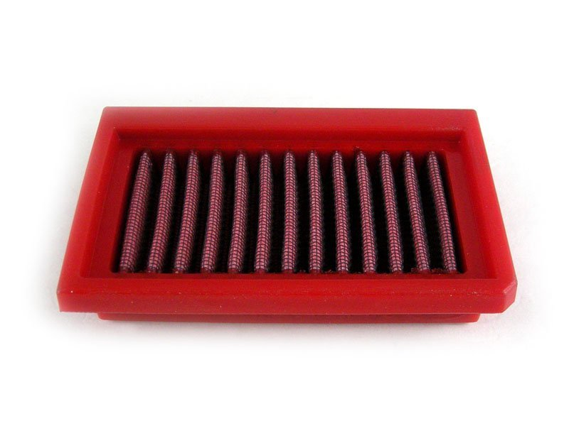 Filtro de potencia Bmc FM736/01 (Versión standard con menos entrada de aire). El filtro de aire Bmc Filter FM736/01 posee un diseño específico y está diseñado para colocar en sustitución al filtro de aire original. El filtro de potencia Bmc FM736/01 de alto rendimiento cuenta con la misma forma que el filtro standard, pero con una base de filtrado mayor. Este filtro reutilizable se caracteriza por su diseño que mejora notablemente la capacidad de aspiración de la toma de aire en comparación con los filtros tradicionales, mejorando también la calidad de la combustión. El filtro de potencia Bmc FM736/01 consta de una gasa de algodón de múltiples capas impregnada con aceite de baja viscosidad y recubierta con una malla de aluminio tratado con resina epoxy que garantiza la protección contra los humos del combustible y la oxidación debida a la humedad del aire. Las impurezas se filtran gracias al efecto pantalla y de retención, siendo capturadas por las fibras de algodón y retenidas por el aceite. Este proceso no obstruye la entrada de aire y garantiza el rendimiento constante del filtro de aire a largo plazo. El proceso de filtrado es continuo y los cuerpos extraños quedan depositados en el tejido sin bloquear el flujo de aire. El filtros Bmc está realizado mediante un sistema de “moldeado completo” que permite al característico filtro rojo ser de una sola pieza, sin juntas soldadas, lo cual evita la rotura. La goma que se utiliza en los sistemas de filtrado de aire Bmc es muy resistente y duradera, y posee unas características de adherencia óptimas para adaptarse a todas las formas de las cajas de aire.