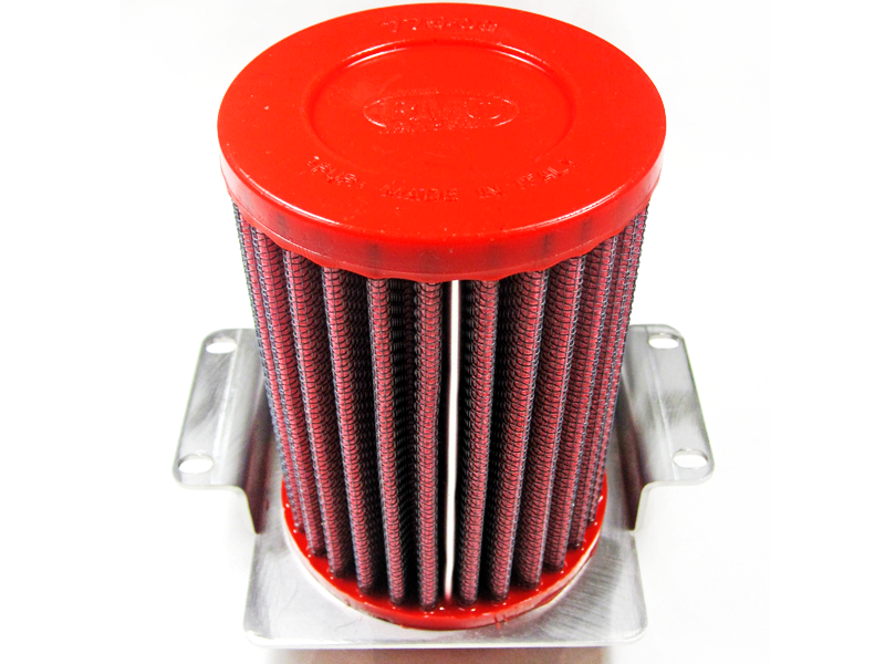 Filtro de potencia Bmc FM775/08 (Versión standard con menos entrada de aire). El filtro de aire Bmc Filter FM775/08 posee un diseño específico y está diseñado para colocar en sustitución al filtro de aire original. El filtro de potencia Bmc FM775/08 de alto rendimiento cuenta con la misma forma que el filtro standard, pero con una base de filtrado mayor. Este filtro reutilizable se caracteriza por su diseño que mejora notablemente la capacidad de aspiración de la toma de aire en comparación con los filtros tradicionales, mejorando también la calidad de la combustión. El filtro de potencia Bmc FM775/08 consta de una gasa de algodón de múltiples capas impregnada con aceite de baja viscosidad y recubierta con una malla de aluminio tratado con resina epoxy que garantiza la protección contra los humos del combustible y la oxidación debida a la humedad del aire. Las impurezas se filtran gracias al efecto pantalla y de retención, siendo capturadas por las fibras de algodón y retenidas por el aceite. Este proceso no obstruye la entrada de aire y garantiza el rendimiento constante del filtro de aire a largo plazo. El proceso de filtrado es continuo y los cuerpos extraños quedan depositados en el tejido sin bloquear el flujo de aire. El filtros Bmc está realizado mediante un sistema de “moldeado completo” que permite al característico filtro rojo ser de una sola pieza, sin juntas soldadas, lo cual evita la rotura. La goma que se utiliza en los sistemas de filtrado de aire Bmc es muy resistente y duradera, y posee unas características de adherencia óptimas para adaptarse a todas las formas de las cajas de aire.