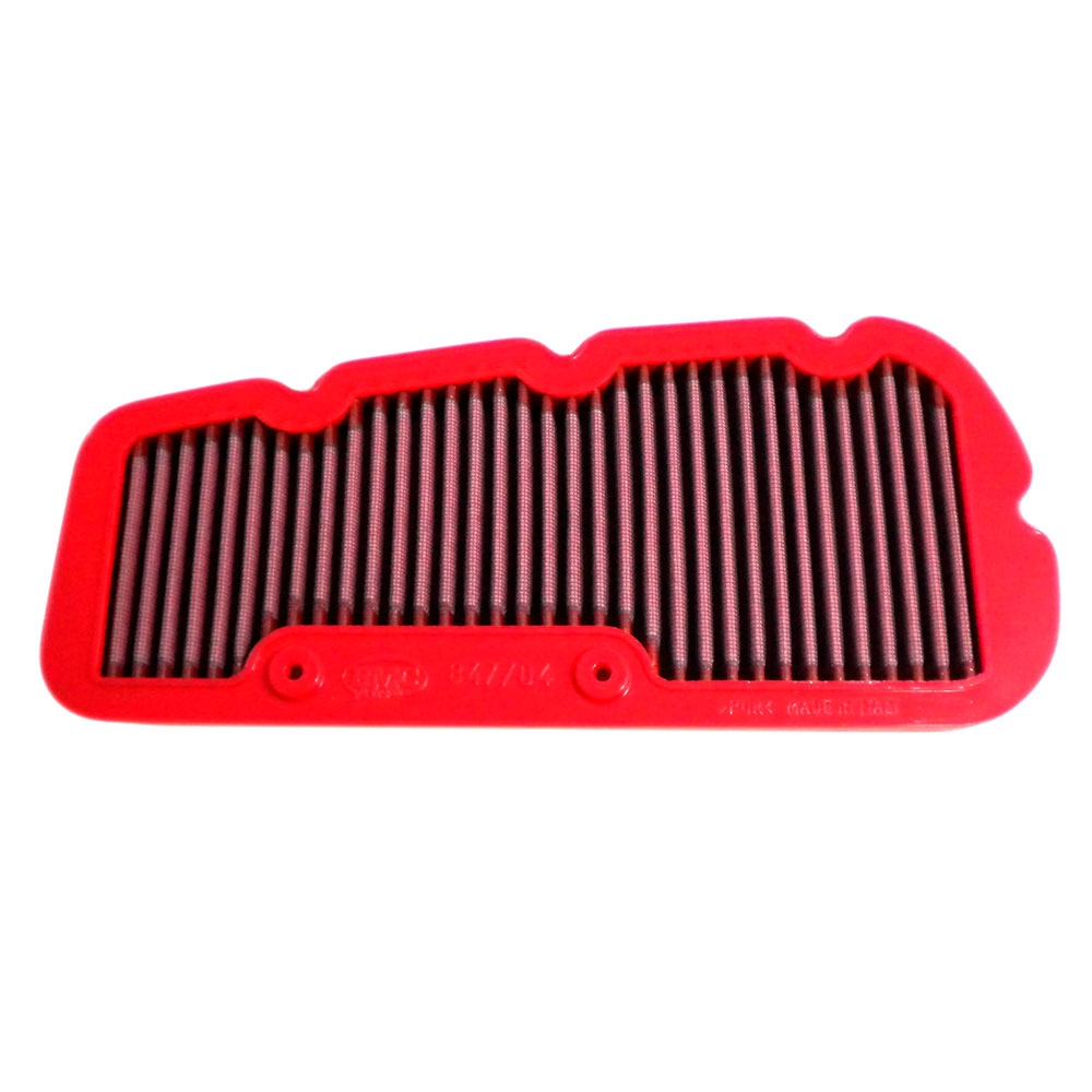 Filtro aire Bmc FM847/04 (Versión standard con menos entrada de aire). El filtro de aire Bmc Filter FM847/04 posee un diseño específico y está diseñado para colocar en sustitución al filtro de aire original. El filtro de potencia Bmc FM847/04 de alto rendimiento cuenta con la misma forma que el filtro standard, pero con una base de filtrado mayor. Este filtro reutilizable se caracteriza por su diseño que mejora notablemente la capacidad de aspiración de la toma de aire en comparación con los filtros tradicionales, mejorando también la calidad de la combustión. El filtro de potencia Bmc FM847/04 consta de una gasa de algodón de múltiples capas impregnada con aceite de baja viscosidad y recubierta con una malla de aluminio tratado con resina epoxy que garantiza la protección contra los humos del combustible y la oxidación debida a la humedad del aire. Las impurezas se filtran gracias al efecto pantalla y de retención, siendo capturadas por las fibras de algodón y retenidas por el aceite. Este proceso no obstruye la entrada de aire y garantiza el rendimiento constante del filtro de aire a largo plazo. El proceso de filtrado es continuo y los cuerpos extraños quedan depositados en el tejido sin bloquear el flujo de aire. El filtros Bmc está realizado mediante un sistema de “moldeado completo” que permite al característico filtro rojo ser de una sola pieza, sin juntas soldadas, lo cual evita la rotura. La goma que se utiliza en los sistemas de filtrado de aire Bmc es muy resistente y duradera, y posee unas características de adherencia óptimas para adaptarse a todas las formas de las cajas de aire.