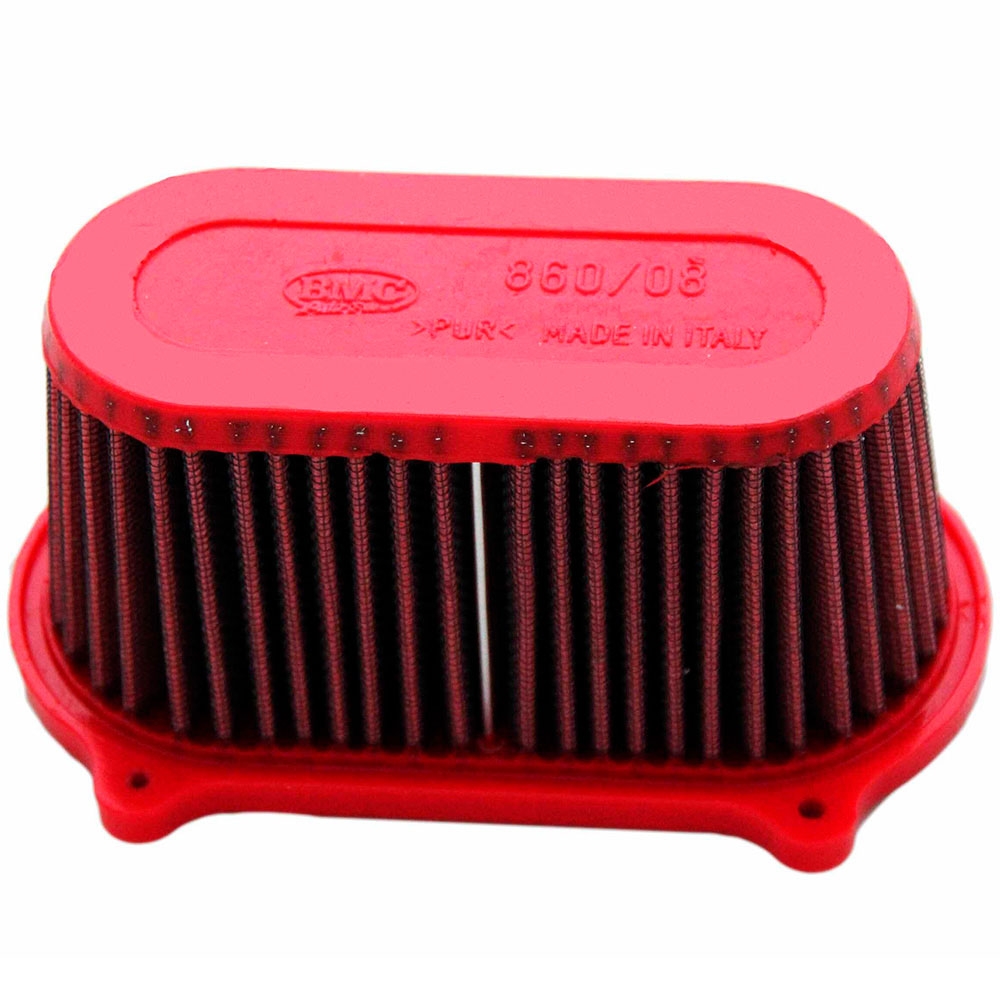 Filtro aire Bmc FM860/08 (Versión standard con menos entrada de aire). El filtro de aire Bmc Filter FM860/08 posee un diseño específico y está diseñado para colocar en sustitución al filtro de aire original. El filtro de potencia Bmc FM860/08 de alto rendimiento cuenta con la misma forma que el filtro standard, pero con una base de filtrado mayor. Este filtro reutilizable se caracteriza por su diseño que mejora notablemente la capacidad de aspiración de la toma de aire en comparación con los filtros tradicionales, mejorando también la calidad de la combustión. El filtro de potencia Bmc FM860/08 consta de una gasa de algodón de múltiples capas impregnada con aceite de baja viscosidad y recubierta con una malla de aluminio tratado con resina epoxy que garantiza la protección contra los humos del combustible y la oxidación debida a la humedad del aire. Las impurezas se filtran gracias al efecto pantalla y de retención, siendo capturadas por las fibras de algodón y retenidas por el aceite. Este proceso no obstruye la entrada de aire y garantiza el rendimiento constante del filtro de aire a largo plazo. El proceso de filtrado es continuo y los cuerpos extraños quedan depositados en el tejido sin bloquear el flujo de aire. El filtros Bmc está realizado mediante un sistema de “moldeado completo” que permite al característico filtro rojo ser de una sola pieza, sin juntas soldadas, lo cual evita la rotura. La goma que se utiliza en los sistemas de filtrado de aire Bmc es muy resistente y duradera, y posee unas características de adherencia óptimas para adaptarse a todas las formas de las cajas de aire.