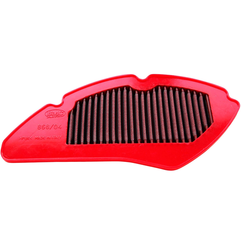 Filtro aire Bmc FM868/04 (Versión standard con menos entrada de aire). El filtro de aire Bmc Filter FM868/04 posee un diseño específico y está diseñado para colocar en sustitución al filtro de aire original. El filtro de potencia Bmc FM868/04 de alto rendimiento cuenta con la misma forma que el filtro standard, pero con una base de filtrado mayor. Este filtro reutilizable se caracteriza por su diseño que mejora notablemente la capacidad de aspiración de la toma de aire en comparación con los filtros tradicionales, mejorando también la calidad de la combustión. El filtro de potencia Bmc FM868/04 consta de una gasa de algodón de múltiples capas impregnada con aceite de baja viscosidad y recubierta con una malla de aluminio tratado con resina epoxy que garantiza la protección contra los humos del combustible y la oxidación debida a la humedad del aire. Las impurezas se filtran gracias al efecto pantalla y de retención, siendo capturadas por las fibras de algodón y retenidas por el aceite. Este proceso no obstruye la entrada de aire y garantiza el rendimiento constante del filtro de aire a largo plazo. El proceso de filtrado es continuo y los cuerpos extraños quedan depositados en el tejido sin bloquear el flujo de aire. El filtros Bmc está realizado mediante un sistema de “moldeado completo” que permite al característico filtro rojo ser de una sola pieza, sin juntas soldadas, lo cual evita la rotura. La goma que se utiliza en los sistemas de filtrado de aire Bmc es muy resistente y duradera, y posee unas características de adherencia óptimas para adaptarse a todas las formas de las cajas de aire.