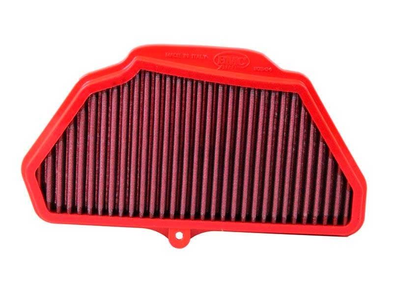 Filtro de potencia Bmc FM903/04RACE Kawasaki ZX-10R 2016 (Versión Race con más entrada de aire). El filtro de aire Bmc Filter FM903/04RACE posee un diseño específico y está diseñado para colocar en sustitución al filtro de aire original. El filtro de potencia Bmc FM903/04RACE de alto rendimiento cuenta con la misma forma que el filtro standard, pero con una base de filtrado mayor incluso que los filtros Bmc standard). Este filtro de carreras reutilizable se caracteriza por su diseño que mejora notablemente la capacidad de aspiración de la toma de aire en comparación con los filtros tradicionales, mejorando también la calidad de la combustión. El filtro de potencia Bmc FM903/04RACE consta de una gasa de algodón de múltiples capas impregnada con aceite de baja viscosidad y recubierta con una malla de aluminio tratado con resina epoxy que garantiza la protección contra los humos del combustible y la oxidación debida a la humedad del aire. Las impurezas se filtran gracias al efecto pantalla y de retención, siendo capturadas por las fibras de algodón y retenidas por el aceite. Este proceso no obstruye la entrada de aire y garantiza el rendimiento constante del filtro de aire a largo plazo. El proceso de filtrado es continuo y los cuerpos extraños quedan depositados en el tejido sin bloquear el flujo de aire. El filtros Bmc está realizado mediante un sistema de “moldeado completo” que permite al característico filtro rojo ser de una sola pieza, sin juntas soldadas, lo cual evita la rotura. La goma que se utiliza en los sistemas de filtrado de aire Bmc es muy resistente y duradera, y posee unas características de adherencia óptimas para adaptarse a todas las formas de las cajas de aire.